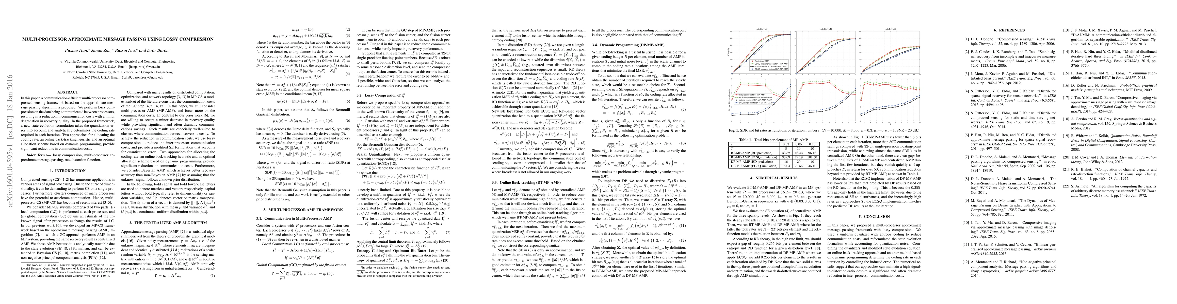 This paper proposes a multi-processor compressed sensing framework using approximate message passing with lossy compression to reduce communication costs. It introduces a new state evolution formulation that considers quantization error and determines the optimal coding rate, employing both heuristic and dynamic programming methods for rate allocation.