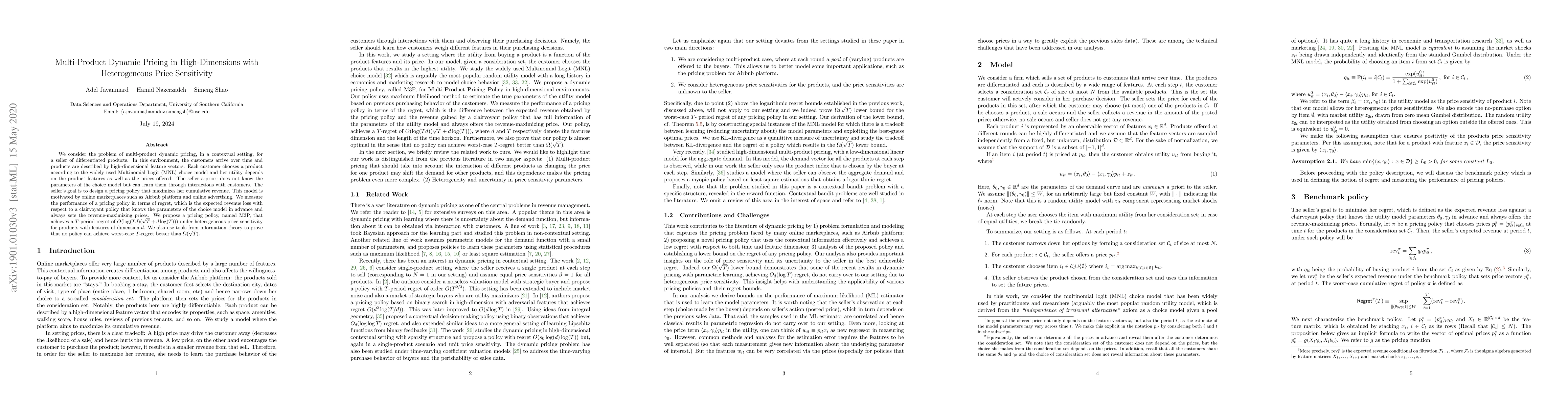 We consider the problem of multi-product dynamic pricing, in a contextual setting, for a seller of differentiated products. In this environment, the customers arrive over time and products are described by high-dimensional feature vectors. Each customer chooses a product according to the widely used Multinomial Logit (MNL) choice model and her utility depends on the product features as well as the prices offered. The seller a-priori does not know the parameters of the choice model but can learn them through interactions with customers. The seller's goal is to design a pricing policy that maximizes her cumulative revenue. This model is motivated by online marketplaces such as Airbnb platform and online advertising. We measure the performance of a pricing policy in terms of regret, which is the expected revenue loss with respect to a clairvoyant policy that knows the parameters of the choice model in advance and always sets the revenue-maximizing prices. We propose a pricing policy, named M3P, that achieves a $T$-period regret of $O(\log(Td) ( \sqrt{T}+ d\log(T)))$ under heterogeneous price sensitivity for products with features of dimension $d$. We also use tools from information theory to prove that no policy can achieve worst-case $T$-regret better than $\Omega(\sqrt{T})$.