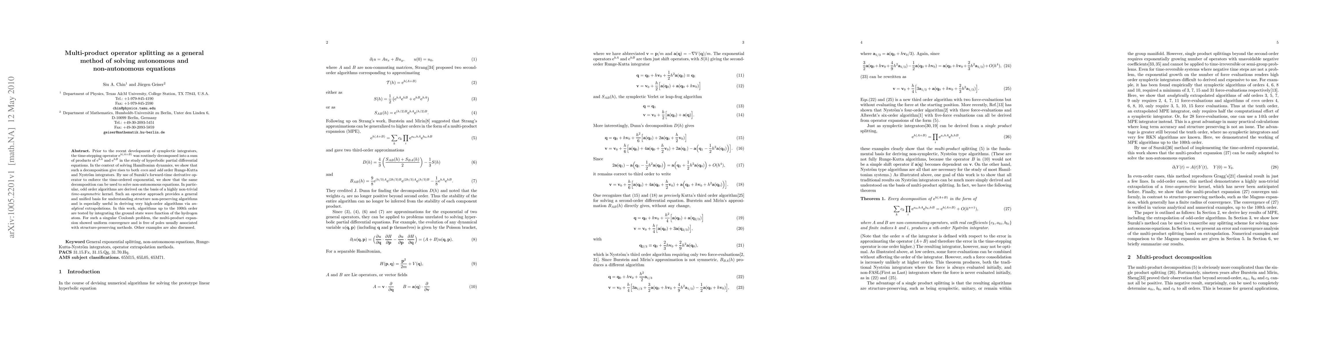 This paper introduces multi-product operator splitting as a method for solving both autonomous and non-autonomous equations, deriving high-order Runge-Kutta and Nyström integrators. It demonstrates the method's effectiveness through analytical extrapolations and tests algorithms up to the 100th order, showing uniform convergence and absence of poles in the hydrogen atom problem.