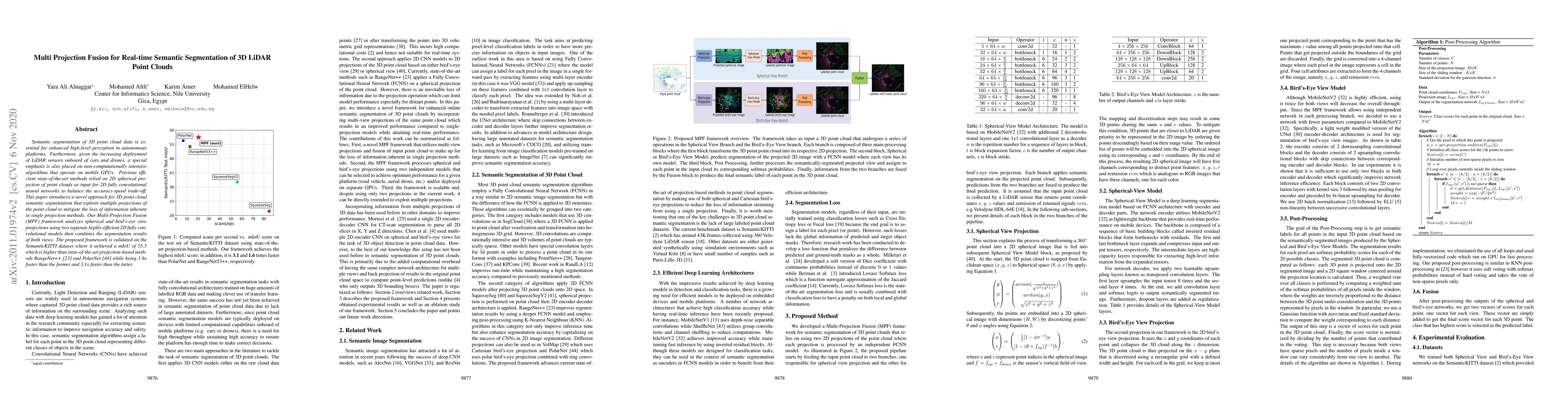 This paper proposes a Multi-Projection Fusion (MPF) framework for real-time semantic segmentation of 3D LiDAR point clouds, combining spherical and bird's-eye view projections to enhance accuracy and efficiency. The method achieves a mIoU of 55.5 on the SemanticKITTI dataset, outperforming existing methods while being significantly faster.