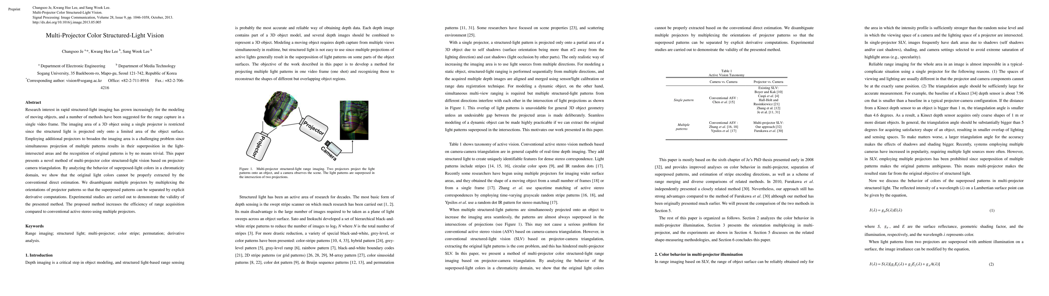 This paper introduces a novel method for multi-projector color structured-light vision, solving the challenge of pattern superposition in multiple projector systems. By multiplexing projector pattern orientations and using derivative computations, the original light colors are disambiguated, increasing the efficiency of range acquisition compared to conventional active stereo techniques.