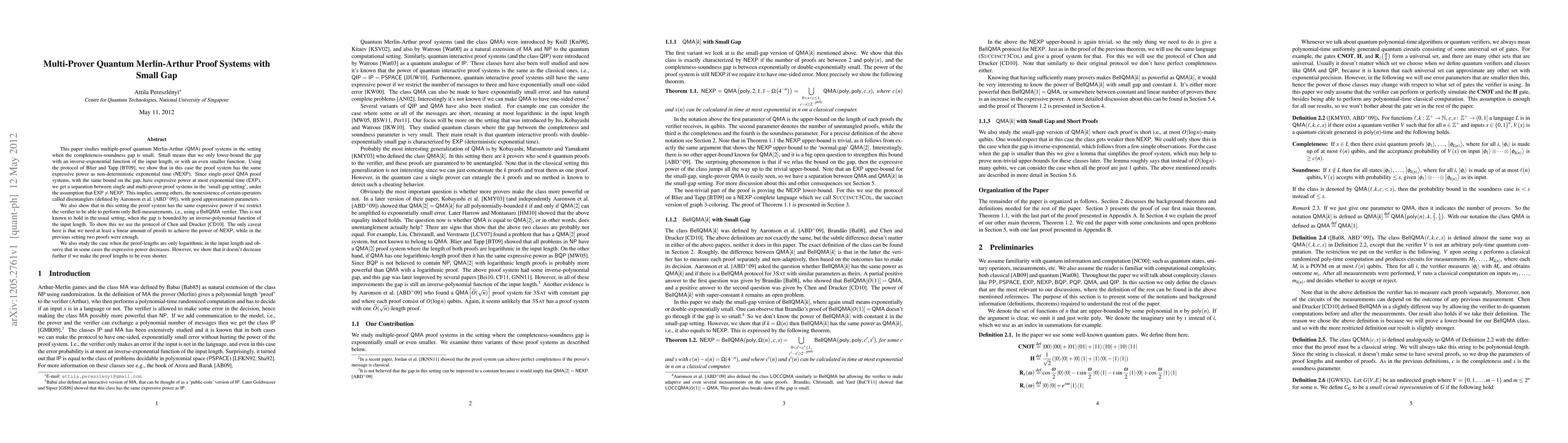 This paper studies multiple-proof quantum Merlin-Arthur (QMA) proof systems in the setting when the completeness-soundness gap is small. Small means that we only lower-bound the gap with an inverse-exponential function of the input length, or with an even smaller function. Using the protocol of Blier and Tapp [arXiv:0709.0738], we show that in this case the proof system has the same expressive power as non-deterministic exponential time (NEXP). Since single-proof QMA proof systems, with the same bound on the gap, have expressive power at most exponential time (EXP), we get a separation between single and multi-prover proof systems in the 'small-gap setting', under the assumption that EXP is not equal to NEXP. This implies, among others, the nonexistence of certain operators called disentanglers (defined by Aaronson et al. [arXiv:0804.0802]), with good approximation parameters. We also show that in this setting the proof system has the same expressive power if we restrict the verifier to be able to perform only Bell-measurements, i.e., using a BellQMA verifier. This is not known to hold in the usual setting, when the gap is bounded by an inverse-polynomial function of the input length. To show this we use the protocol of Chen and Drucker [arXiv:1011.0716]. The only caveat here is that we need at least a linear amount of proofs to achieve the power of NEXP, while in the previous setting two proofs were enough. We also study the case when the proof-lengths are only logarithmic in the input length and observe that in some cases the expressive power decreases. However, we show that it doesn't decrease further if we make the proof lengths to be even shorter.