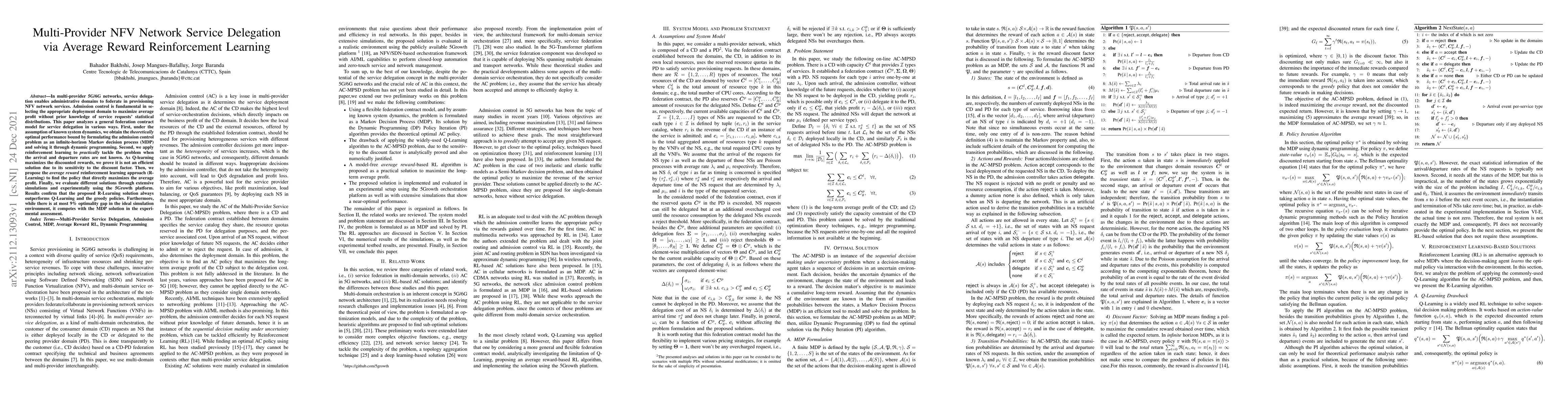 In multi-provider 5G/6G networks, service delegation enables administrative domains to federate in provisioning NFV network services. Admission control is fundamental in selecting the appropriate deployment domain to maximize average profit without prior knowledge of service requests' statistical distributions. This paper analyzes a general federation contract model for service delegation in various ways. First, under the assumption of known system dynamics, we obtain the theoretically optimal performance bound by formulating the admission control problem as an infinite-horizon Markov decision process (MDP) and solving it through dynamic programming. Second, we apply reinforcement learning to practically tackle the problem when the arrival and departure rates are not known. As Q-learning maximizes the discounted rewards, we prove it is not an efficient solution due to its sensitivity to the discount factor. Then, we propose the average reward reinforcement learning approach (R-Learning) to find the policy that directly maximizes the average profit. Finally, we evaluate different solutions through extensive simulations and experimentally using the 5Growth platform. Results confirm that the proposed R-Learning solution always outperforms Q-Learning and the greedy policies. Furthermore, while there is at most 9% optimality gap in the ideal simulation environment, it competes with the MDP solution in the experimental assessment.