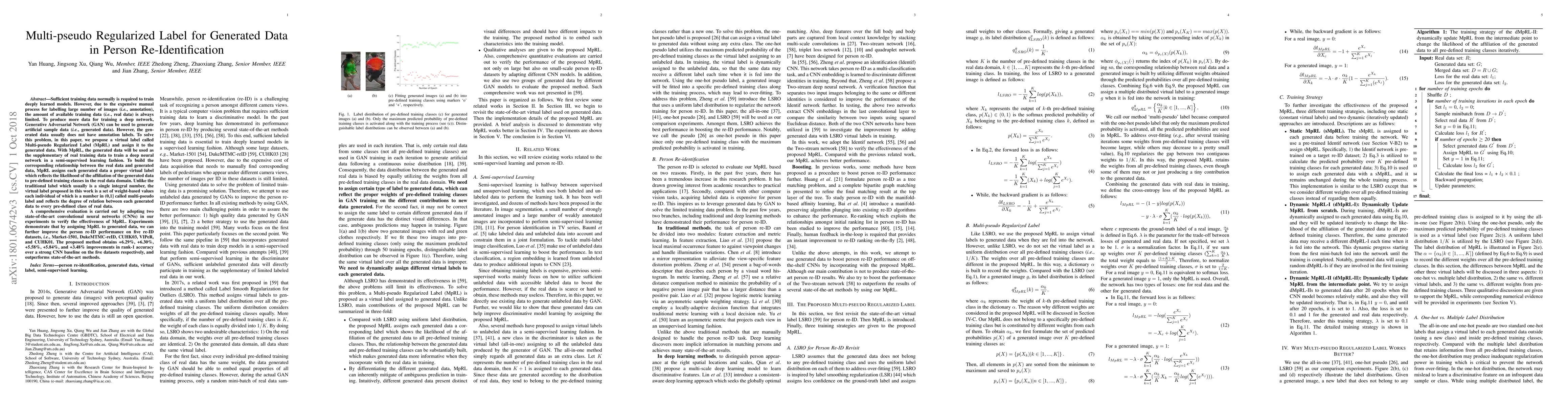 Sufficient training data normally is required to train deeply learned models. However, due to the expensive manual process for labelling large number of images, the amount of available training data is always limited. To produce more data for training a deep network, Generative Adversarial Network (GAN) can be used to generate artificial sample data. However, the generated data usually does not have annotation labels. To solve this problem, in this paper, we propose a virtual label called Multi-pseudo Regularized Label (MpRL) and assign it to the generated data. With MpRL, the generated data will be used as the supplementary of real training data to train a deep neural network in a semi-supervised learning fashion. To build the corresponding relationship between the real data and generated data, MpRL assigns each generated data a proper virtual label which reflects the likelihood of the affiliation of the generated data to pre-defined training classes in the real data domain. Unlike the traditional label which usually is a single integral number, the virtual label proposed in this work is a set of weight-based values each individual of which is a number in (0,1] called multi-pseudo label and reflects the degree of relation between each generated data to every pre-defined class of real data. A comprehensive evaluation is carried out by adopting two state-of-the-art convolutional neural networks (CNNs) in our experiments to verify the effectiveness of MpRL. Experiments demonstrate that by assigning MpRL to generated data, we can further improve the person re-ID performance on five re-ID datasets, i.e., Market-1501, DukeMTMC-reID, CUHK03, VIPeR, and CUHK01. The proposed method obtains +6.29%, +6.30%, +5.58%, +5.84%, and +3.48% improvements in rank-1 accuracy over a strong CNN baseline on the five datasets respectively, and outperforms state-of-the-art methods.