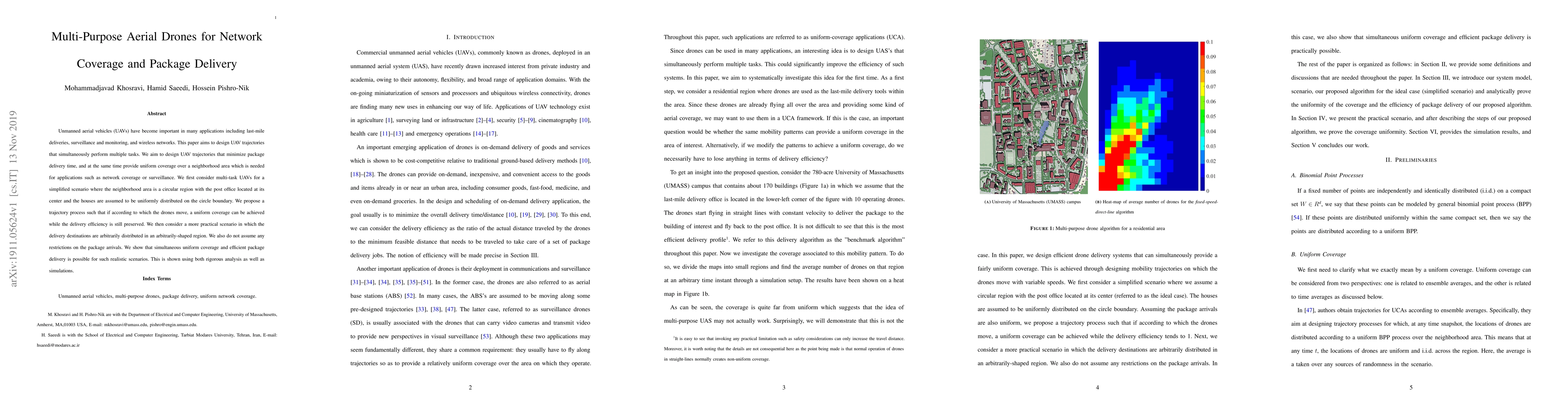 Unmanned aerial vehicles (UAVs) have become important in many applications including last-mile deliveries, surveillance and monitoring, and wireless networks. This paper aims to design UAV trajectories that simultaneously perform multiple tasks. We aim to design UAV trajectories that minimize package delivery time, and at the same time provide uniform coverage over a neighborhood area which is needed for applications such as network coverage or surveillance. We first consider multi-task UAVs for a simplified scenario where the neighborhood area is a circular region with the post office located at its center and the houses are assumed to be uniformly distributed on the circle boundary. We propose a trajectory process such that if according to which the drones move, a uniform coverage can be achieved while the delivery efficiency is still preserved. We then consider a more practical scenario in which the delivery destinations are arbitrarily distributed in an arbitrarily-shaped region. We also do not assume any restrictions on the package arrivals. We show that simultaneous uniform coverage and efficient package delivery is possible for such realistic scenarios. This is shown using both rigorous analyses as well as simulations.