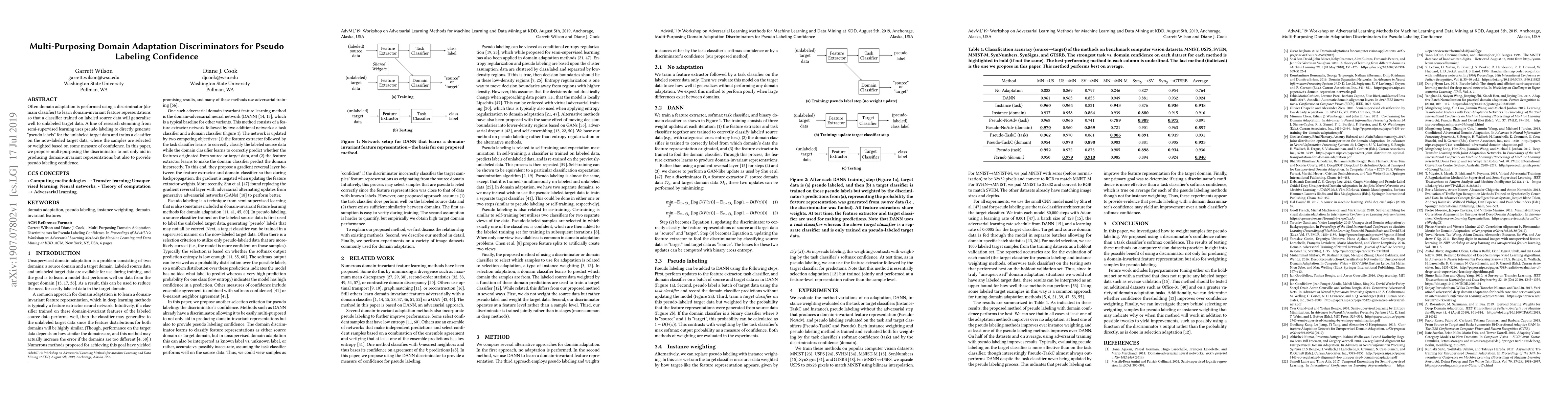 Often domain adaptation is performed using a discriminator (domain classifier) to learn domain-invariant feature representations so that a classifier trained on labeled source data will generalize well to unlabeled target data. A line of research stemming from semi-supervised learning uses pseudo labeling to directly generate "pseudo labels" for the unlabeled target data and trains a classifier on the now-labeled target data, where the samples are selected or weighted based on some measure of confidence. In this paper, we propose multi-purposing the discriminator to not only aid in producing domain-invariant representations but also to provide pseudo labeling confidence.