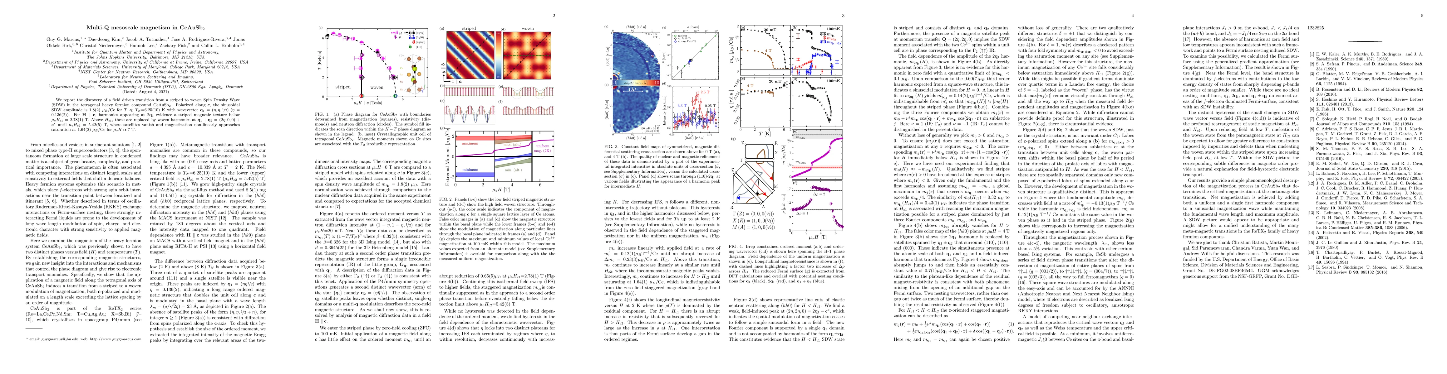 We report the discovery of a field driven transition from a striped to woven Spin Density Wave (SDW) in the tetragonal heavy fermion compound CeAuSb$_2$. Polarized along $\bf c$, the sinusoidal SDW amplitude is 1.8(2) $\mu_B$/Ce for $T \ll T_N$=6.25(10) K with wavevector ${\bf q}_{1}=( \eta, \eta, \frac{1}{2} )$ ($\eta=0.136(2)$). For ${\bf H}\parallel{\bf c}$, harmonics appearing at $2{\bf q}_{1}$ evidence a striped magnetic texture below $\mu_\circ H_{c1}=2.78(1)$ T. Above $H_{c1}$, these are replaced by woven harmonics at ${\bf q}_{1}+{\bf q}_2=(2\eta, 0, 0)+{\bf c}^*$ until $\mu_\circ H_{c2}=5.42(5)$ T, where satellites vanish and magnetization non-linearly approaches saturation at 1.64(2) $\mu_B$/Ce for $\mu_\circ H\approx 7$ T.