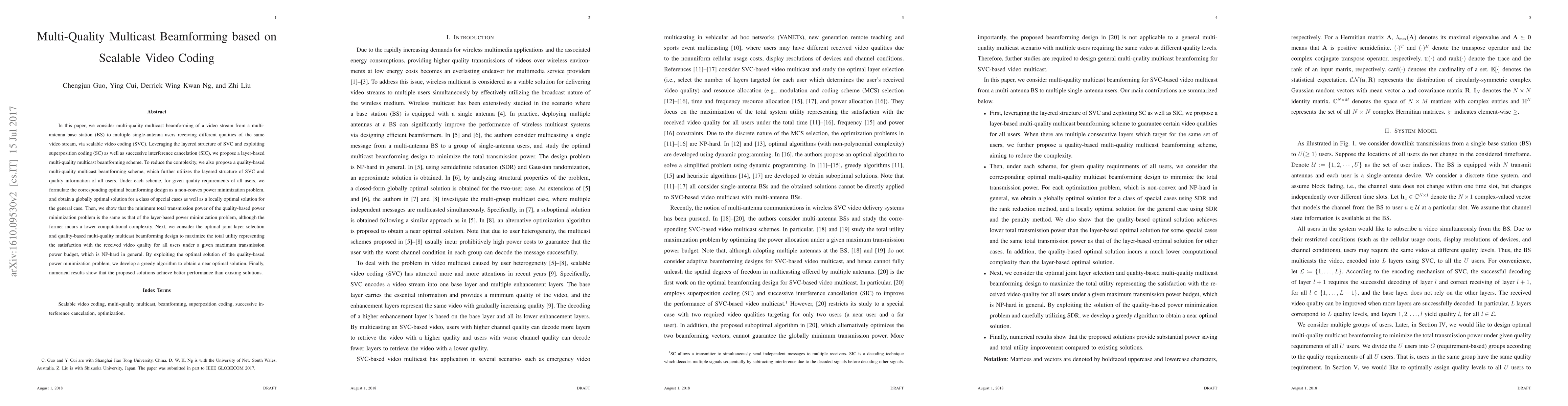 This paper proposes multi-quality multicast beamforming schemes for video streaming from a multi-antenna base station to multiple users using scalable video coding. It formulates optimal beamforming designs to minimize power while leveraging the layered structure of SVC, achieving better performance with lower computational complexity compared to existing solutions.