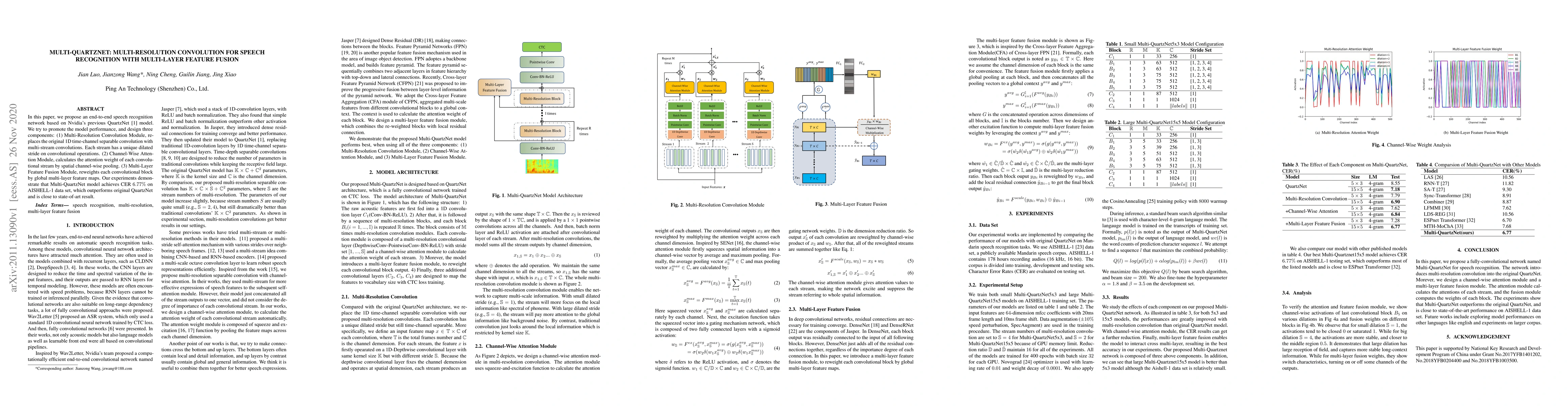 In this paper, we propose an end-to-end speech recognition network based on Nvidia's previous QuartzNet model. We try to promote the model performance, and design three components: (1) Multi-Resolution Convolution Module, replaces the original 1D time-channel separable convolution with multi-stream convolutions. Each stream has a unique dilated stride on convolutional operations. (2) Channel-Wise Attention Module, calculates the attention weight of each convolutional stream by spatial channel-wise pooling. (3) Multi-Layer Feature Fusion Module, reweights each convolutional block by global multi-layer feature maps. Our experiments demonstrate that Multi-QuartzNet model achieves CER 6.77% on AISHELL-1 data set, which outperforms original QuartzNet and is close to state-of-art result.