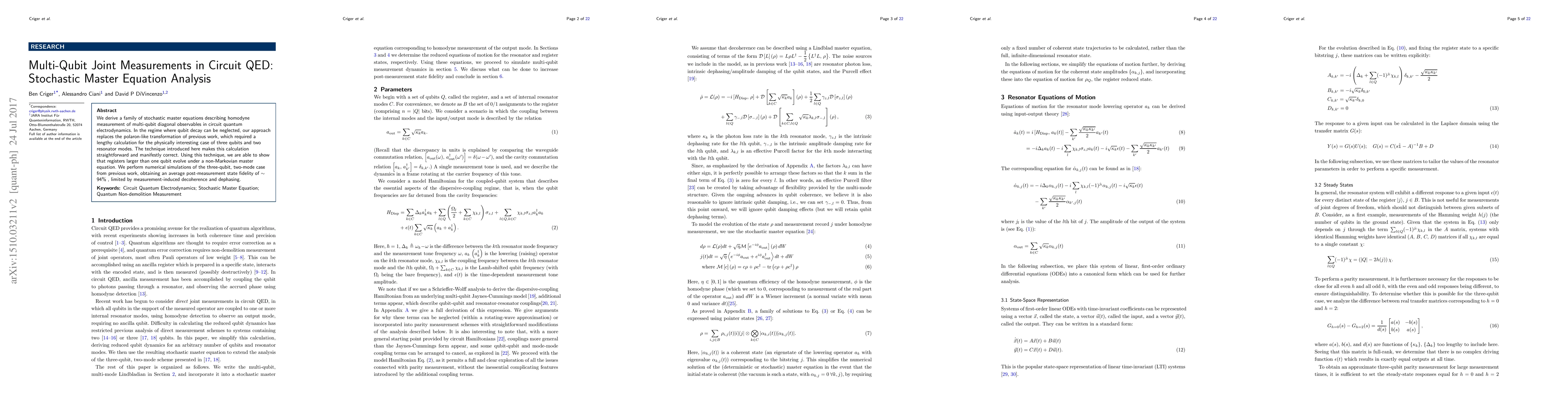 We derive a family of stochastic master equations describing homodyne measurement of multi-qubit diagonal observables in circuit quantum electrodynamics. In the regime where qubit decay can be neglected, our approach replaces the polaron-like transformation of previous work, which required a lengthy calculation for the physically interesting case of three qubits and two resonator modes. The technique introduced here makes this calculation straightforward and manifestly correct. Using this technique, we are able to show that registers larger than one qubit evolve under a non-Markovian master equation. We perform numerical simulations of the three-qubit, two-mode case from previous work, obtaining an average post-measurement state fidelity of $\sim 94\%$, limited by measurement-induced decoherence and dephasing.