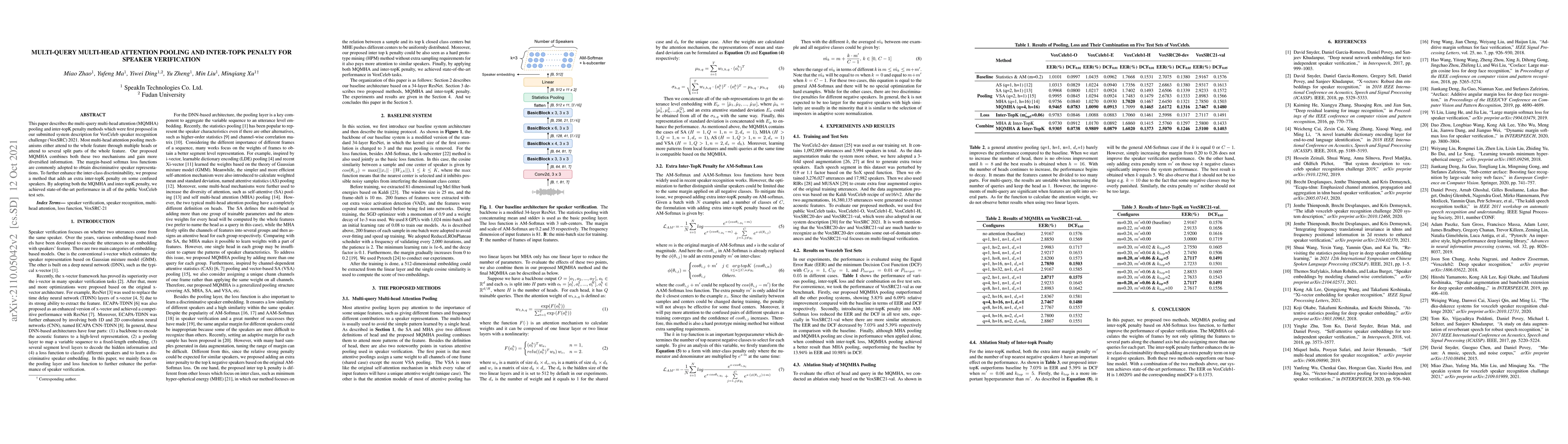 This paper describes the multi-query multi-head attention (MQMHA) pooling and inter-topK penalty methods which were first proposed in our submitted system description for VoxCeleb speaker recognition challenge (VoxSRC) 2021. Most multi-head attention pooling mechanisms either attend to the whole feature through multiple heads or attend to several split parts of the whole feature. Our proposed MQMHA combines both these two mechanisms and gain more diversified information. The margin-based softmax loss functions are commonly adopted to obtain discriminative speaker representations. To further enhance the inter-class discriminability, we propose a method that adds an extra inter-topK penalty on some confused speakers. By adopting both the MQMHA and inter-topK penalty, we achieved state-of-the-art performance in all of the public VoxCeleb test sets.