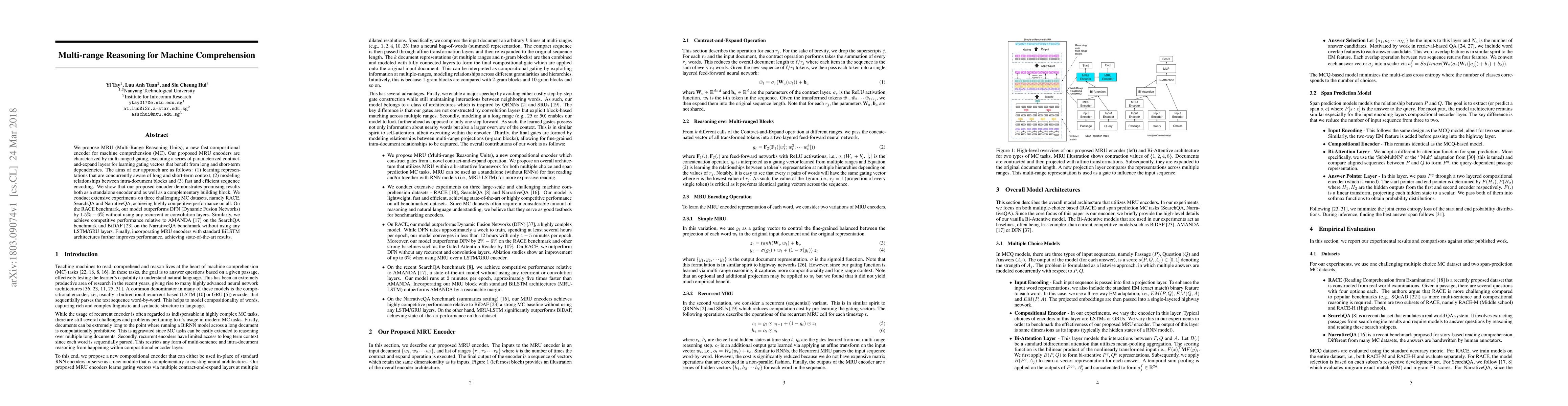 We propose MRU (Multi-Range Reasoning Units), a new fast compositional encoder for machine comprehension (MC). Our proposed MRU encoders are characterized by multi-ranged gating, executing a series of parameterized contract-and-expand layers for learning gating vectors that benefit from long and short-term dependencies. The aims of our approach are as follows: (1) learning representations that are concurrently aware of long and short-term context, (2) modeling relationships between intra-document blocks and (3) fast and efficient sequence encoding. We show that our proposed encoder demonstrates promising results both as a standalone encoder and as well as a complementary building block. We conduct extensive experiments on three challenging MC datasets, namely RACE, SearchQA and NarrativeQA, achieving highly competitive performance on all. On the RACE benchmark, our model outperforms DFN (Dynamic Fusion Networks) by 1.5%-6% without using any recurrent or convolution layers. Similarly, we achieve competitive performance relative to AMANDA on the SearchQA benchmark and BiDAF on the NarrativeQA benchmark without using any LSTM/GRU layers. Finally, incorporating MRU encoders with standard BiLSTM architectures further improves performance, achieving state-of-the-art results.