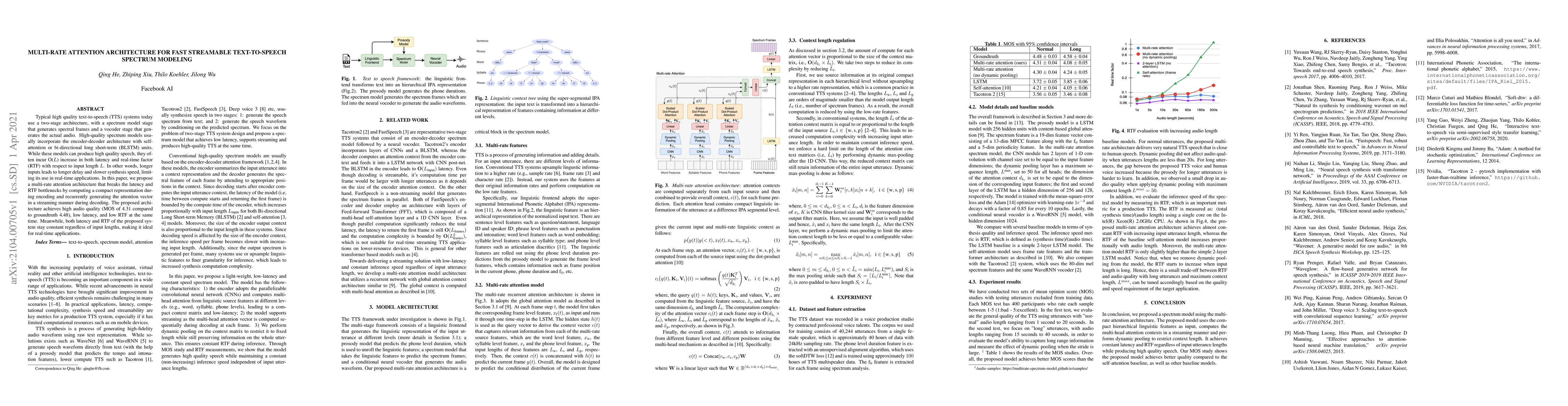 Typical high quality text-to-speech (TTS) systems today use a two-stage architecture, with a spectrum model stage that generates spectral frames and a vocoder stage that generates the actual audio. High-quality spectrum models usually incorporate the encoder-decoder architecture with self-attention or bi-directional long short-term (BLSTM) units. While these models can produce high quality speech, they often incur O($L$) increase in both latency and real-time factor (RTF) with respect to input length $L$. In other words, longer inputs leads to longer delay and slower synthesis speed, limiting its use in real-time applications. In this paper, we propose a multi-rate attention architecture that breaks the latency and RTF bottlenecks by computing a compact representation during encoding and recurrently generating the attention vector in a streaming manner during decoding. The proposed architecture achieves high audio quality (MOS of 4.31 compared to groundtruth 4.48), low latency, and low RTF at the same time. Meanwhile, both latency and RTF of the proposed system stay constant regardless of input lengths, making it ideal for real-time applications.