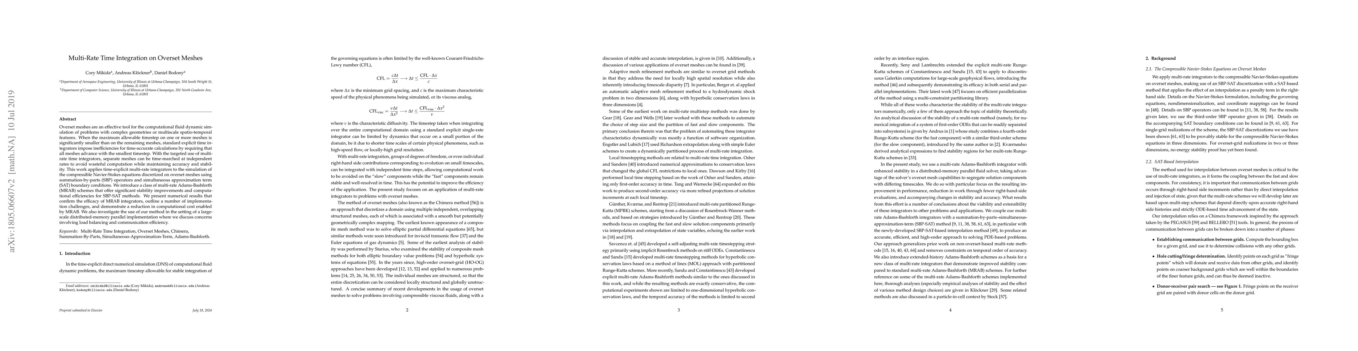 Overset meshes are an effective tool for the computational fluid dynamic simulation of problems with complex geometries or multiscale spatio-temporal features. When the maximum allowable timestep on one or more meshes is significantly smaller than on the remaining meshes, standard explicit time integrators impose inefficiencies for time-accurate calculations by requiring that all meshes advance with the smallest timestep. With the targeted use of multi-rate time integrators, separate meshes can be time-marched at independent rates to avoid wasteful computation while maintaining accuracy and stability. This work applies time-explicit multi-rate integrators to the simulation of the compressible Navier-Stokes equations discretized on overset meshes using summation-by-parts (SBP) operators and simultaneous approximation term (SAT) boundary conditions. We introduce a class of multi-rate Adams-Bashforth (MRAB) schemes that offer significant stability improvements and computational efficiencies for SBP-SAT methods. We present numerical results that confirm the efficacy of MRAB integrators, outline a number of implementation challenges, and demonstrate a reduction in computational cost enabled by MRAB. We also investigate the use of our method in the setting of a large-scale distributed-memory parallel implementation where we discuss concerns involving load balancing and communication efficiency.