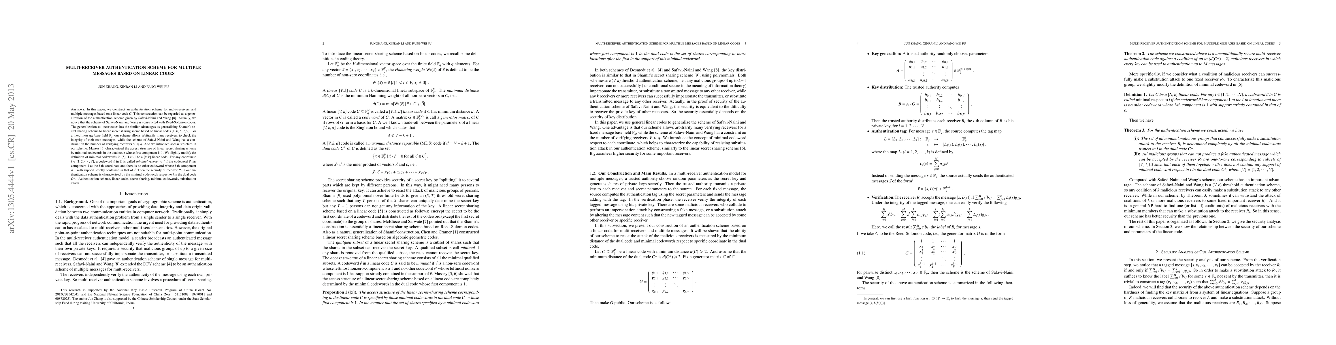 This paper proposes an authentication scheme for multi-receivers and multiple messages based on linear codes, generalizing the scheme by Safavi-Naini and Wang which uses Reed-Solomon codes. The new scheme allows any number of receivers to verify message integrity without constraints, unlike the original scheme which limits the number of verifiers.