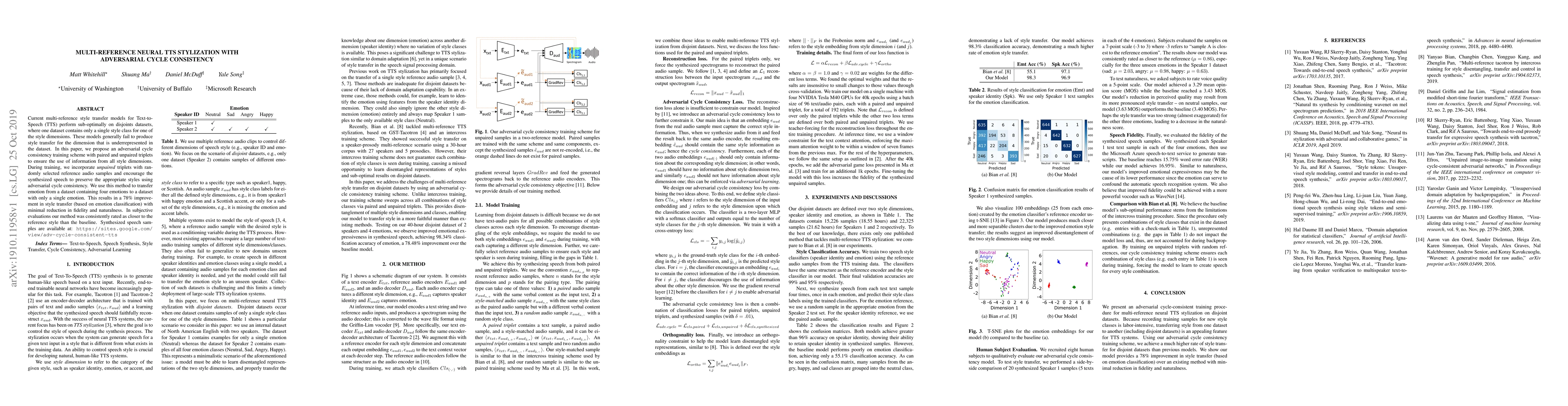This paper proposes an adversarial cycle consistency training scheme for multi-reference neural TTS stylization, using paired and unpaired triplets to improve style transfer across datasets with varying style representations. The method achieves a 78% improvement in emotion classification accuracy while maintaining speech fidelity.