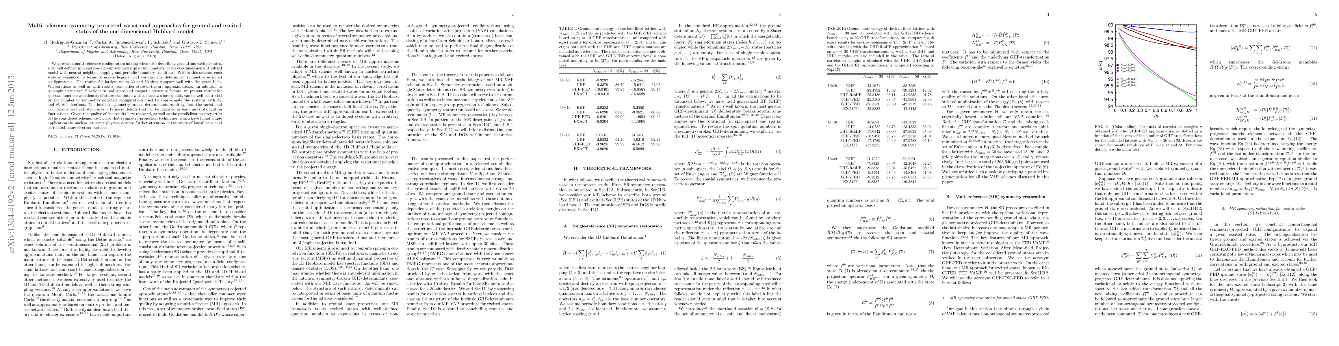 We present a multi-reference configuration mixing scheme for describing ground and excited states, with well defined spin and space group symmetry quantum numbers, of the one-dimensional Hubbard model with nearest-neighbor hopping and periodic boundary conditions. Within this scheme, each state is expanded in terms of non-orthogonal and variationally determined symmetry-projected configurations. The results for lattices up to 30 and 50 sites compare well with the exact Lieb-Wu solutions as well as with results from other state-of-the-art approximations. In addition to spin-spin correlation functions in real space and magnetic structure factors, we present results for spectral functions and density of states computed with an ansatz whose quality can be well-controlled by the number of symmetry-projected configurations used to approximate the systems with $N_{e}$ and $N_{e} \pm 1$ electrons. The intrinsic symmetry-broken determinants resulting from the variational calculations have rich structures in terms of defects that can be regarded as basic units of quantum fluctuations. Given the quality of the results here reported, as well as the parallelization properties of the considered scheme, we believe that symmetry-projection techniques, which have found ample applications in nuclear structure physics, deserve further attention in the study of low-dimensional correlated many-electron systems.