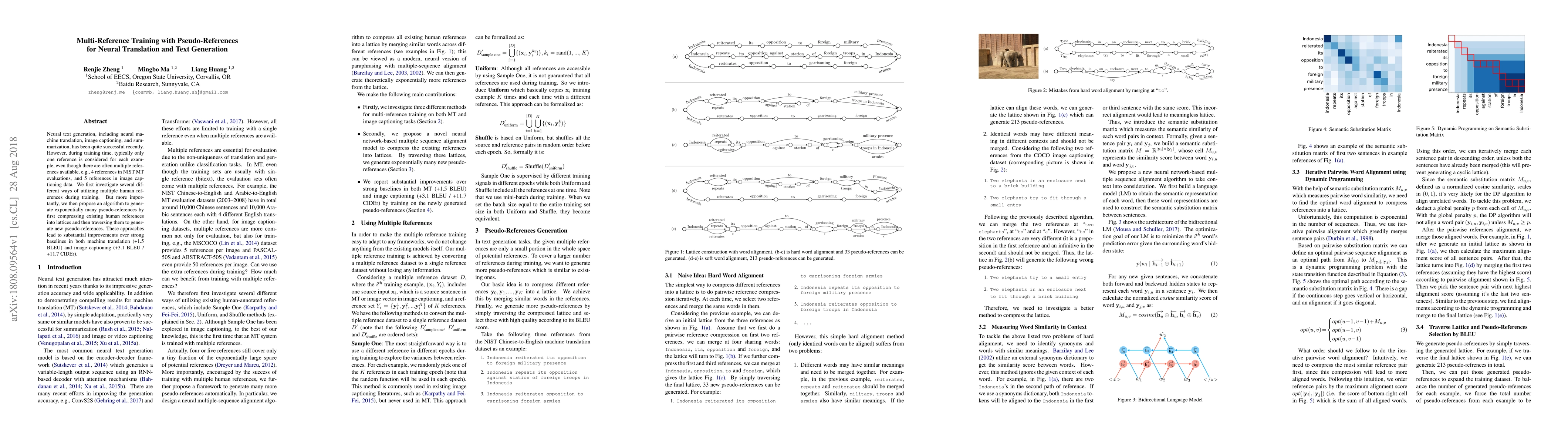 Neural text generation, including neural machine translation, image captioning, and summarization, has been quite successful recently. However, during training time, typically only one reference is considered for each example, even though there are often multiple references available, e.g., 4 references in NIST MT evaluations, and 5 references in image captioning data. We first investigate several different ways of utilizing multiple human references during training. But more importantly, we then propose an algorithm to generate exponentially many pseudo-references by first compressing existing human references into lattices and then traversing them to generate new pseudo-references. These approaches lead to substantial improvements over strong baselines in both machine translation (+1.5 BLEU) and image captioning (+3.1 BLEU / +11.7 CIDEr).