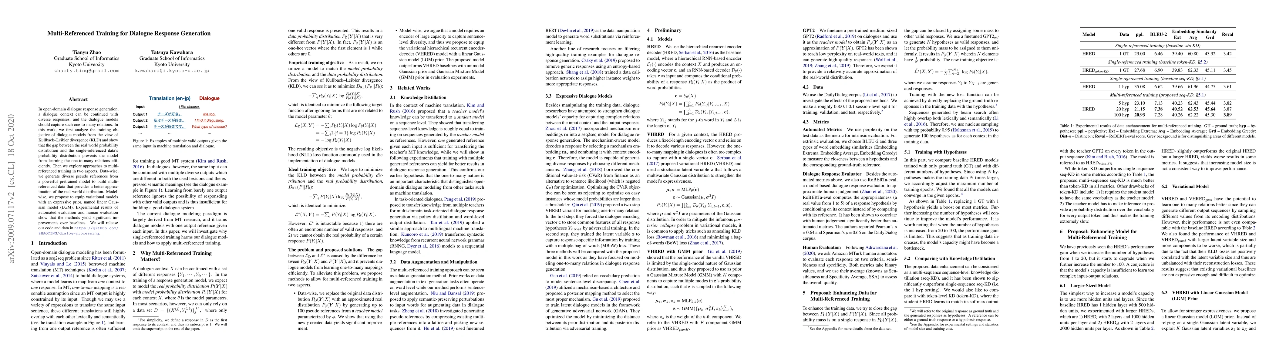 This paper investigates the challenges of generating diverse dialogue responses and proposes multi-referenced training methods to improve model efficiency. It introduces diverse pseudo references and a linear Gaussian model to better capture one-to-many relations, resulting in significant improvements over baselines.