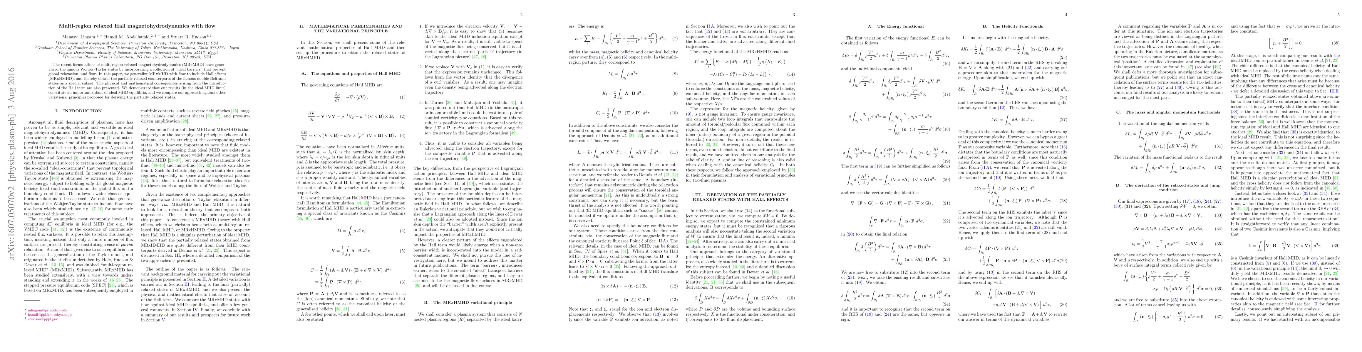 The paper generalizes multi-region relaxed magnetohydrodynamics (MRxMHD) to include Hall effects, obtaining partially relaxed counterparts of double Beltrami states as a subset. It also compares the approach against other variational principles for deriving partially relaxed states.