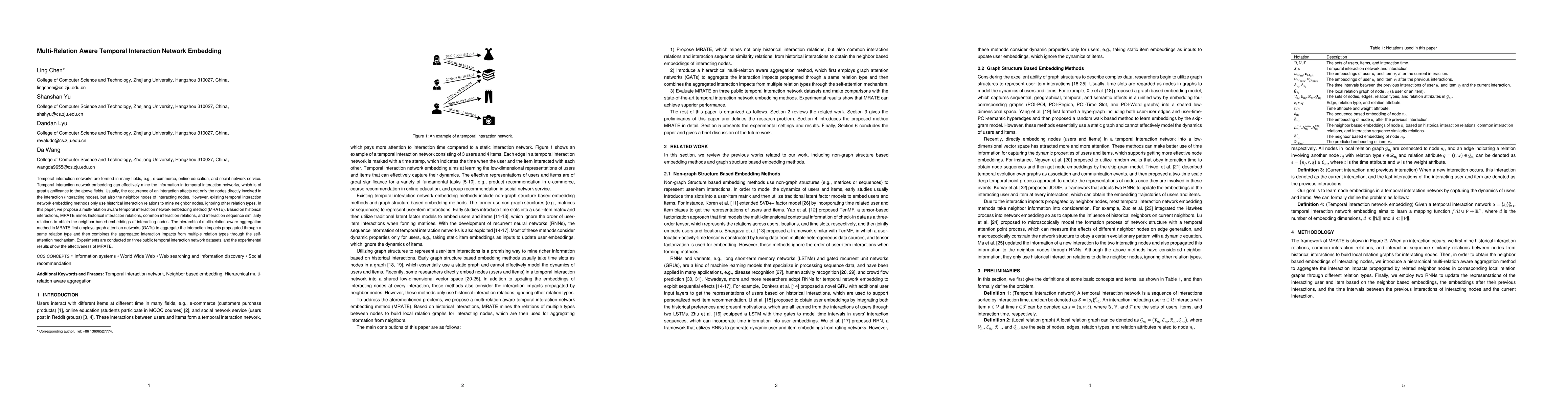 This paper introduces a Multi-Relation Aware Temporal Interaction Network Embedding (MRATE) method that incorporates historical interaction, common interaction, and interaction sequence similarity to enhance node embeddings. MRATE uses graph attention networks and self-attention mechanisms to aggregate and combine multiple relation types for improved performance, validated on three public datasets.