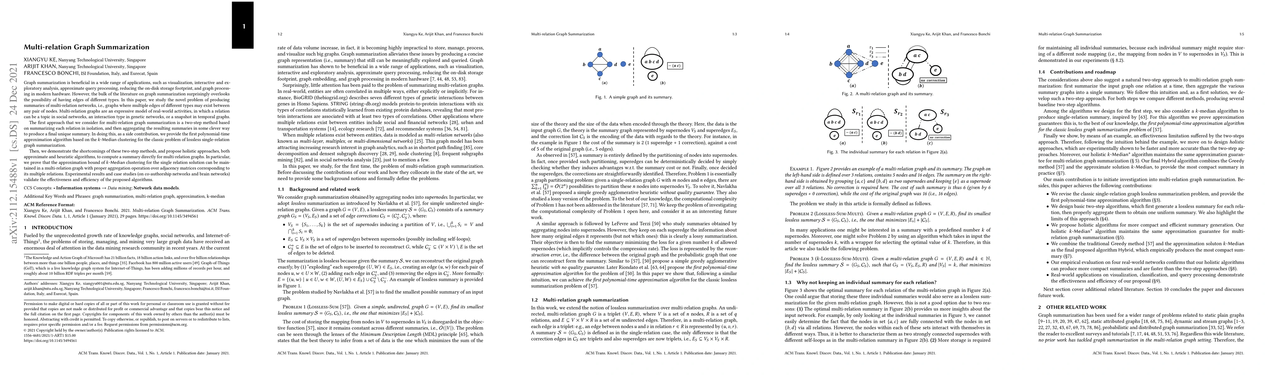 This paper introduces methods for summarizing multi-relation graphs, where multiple edge types exist between nodes. It proposes a two-step method summarizing each relation separately and then aggregating them, alongside a polynomial-time approximation algorithm for single-relation graphs. It also presents holistic approaches for multi-relation graphs, demonstrating their effectiveness through experiments on co-authorship and brain networks.