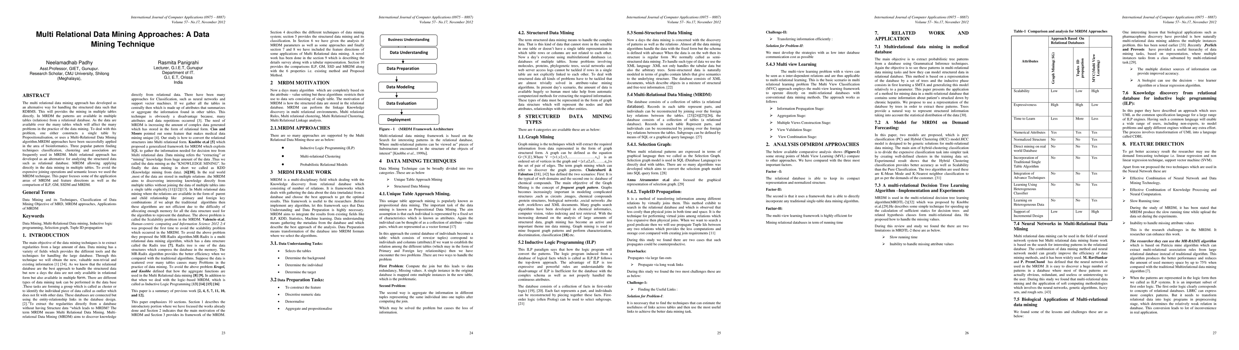 The paper discusses Multi Relational Data Mining (MRDM) as an approach to handle structured data, specifically relational databases, by mining patterns directly from multiple tables without constructing a single table through propositionalisation or using expensive joining operations.