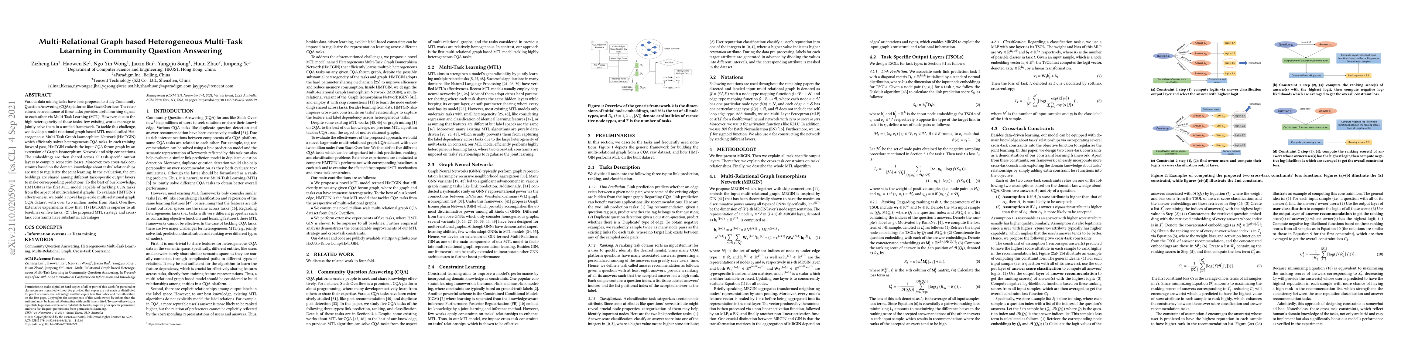 This paper proposes a multi-relational graph based Heterogeneous Multi-Task Graph Isomorphism Network (HMTGIN) to efficiently solve heterogeneous Community Question Answering (CQA) tasks. The model leverages graph embeddings and cross-task constraints to improve joint learning, achieving superior performance on a large-scale CQA dataset from Stack Overflow.
