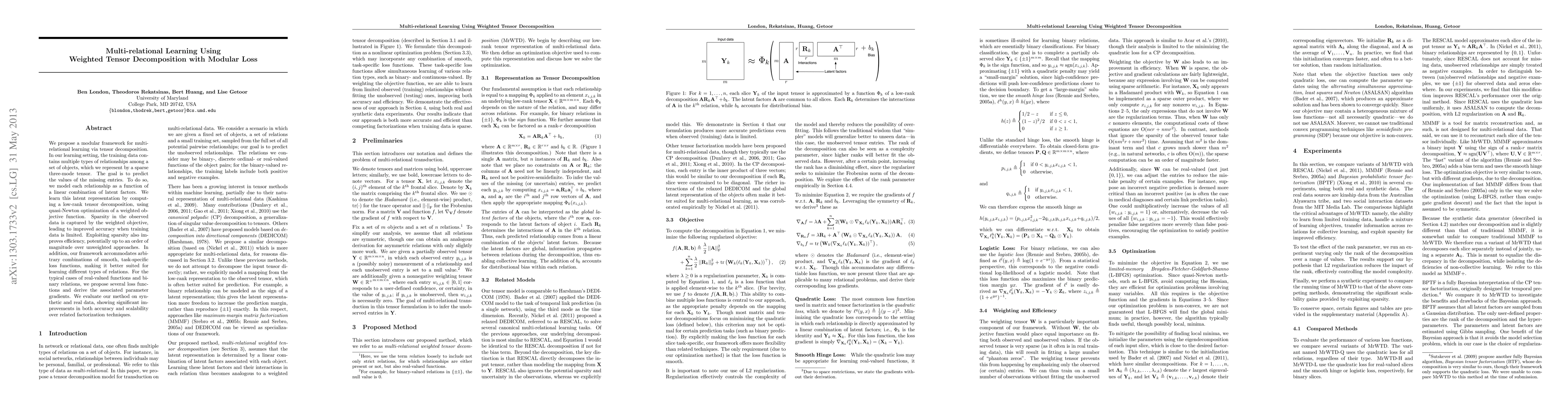 This paper proposes a new method for multi-relational learning using weighted tensor decomposition with modular loss, which improves accuracy and scalability over existing factorization techniques, especially when training data is limited.