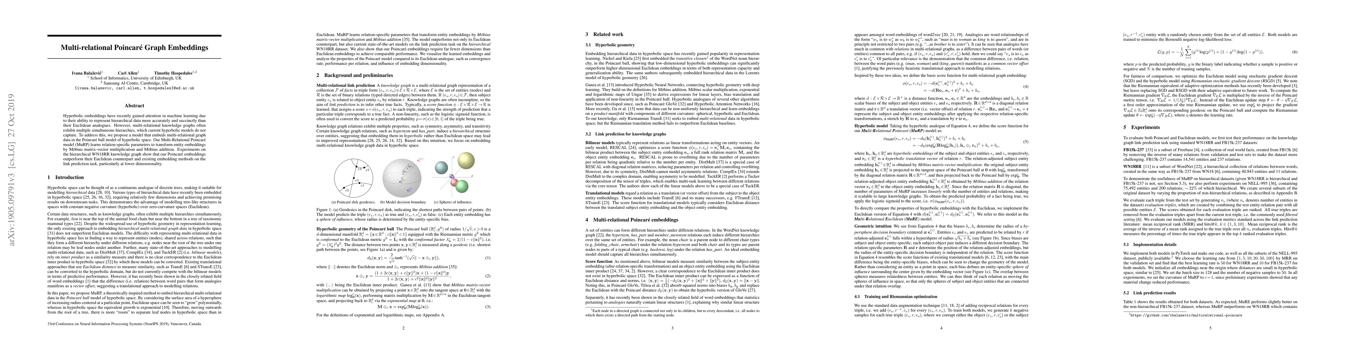 This paper proposes a Multi-Relational Poincar\'e Graph Embeddings model (MuRP) to better represent multi-relational knowledge graphs with multiple hierarchies. The model uses Poincar\'e ball embeddings and relation-specific transformations, achieving superior performance on link prediction tasks compared to Euclidean and existing methods.