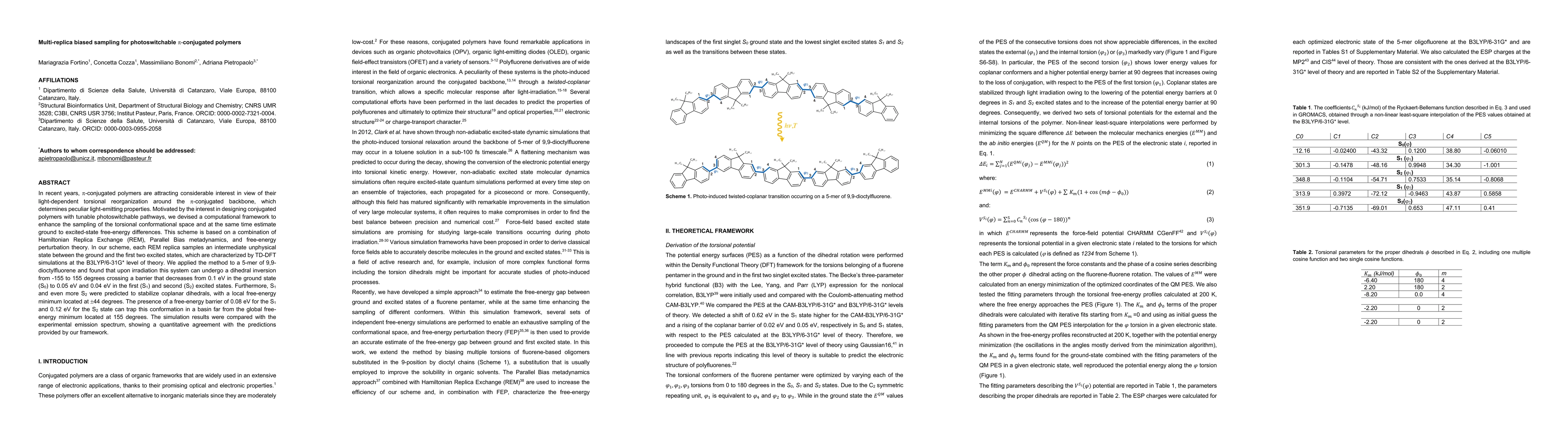 This paper proposes a computational framework combining Hamiltonian Replica Exchange, Parallel Bias metadynamics, and free-energy perturbation theory to study the photoswitchable properties of pi-conjugated polymers. The method successfully predicts the conformational changes and energy barriers in a 5-mer of 9,9-dioctylfluorene, showing quantitative agreement with experimental data.