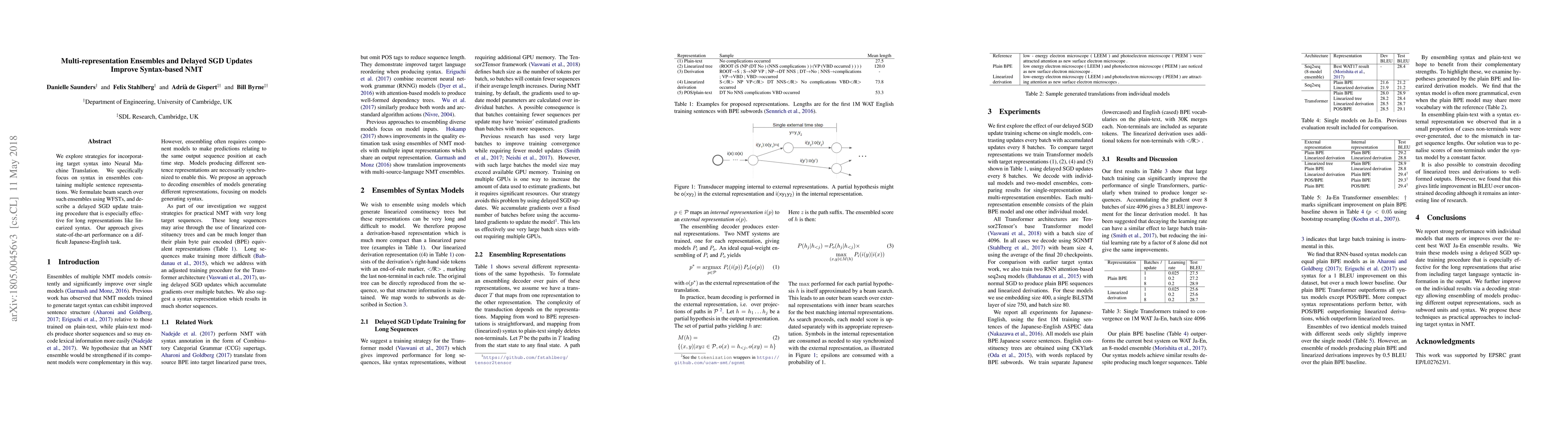 We explore strategies for incorporating target syntax into Neural Machine Translation. We specifically focus on syntax in ensembles containing multiple sentence representations. We formulate beam search over such ensembles using WFSTs, and describe a delayed SGD update training procedure that is especially effective for long representations like linearized syntax. Our approach gives state-of-the-art performance on a difficult Japanese-English task.