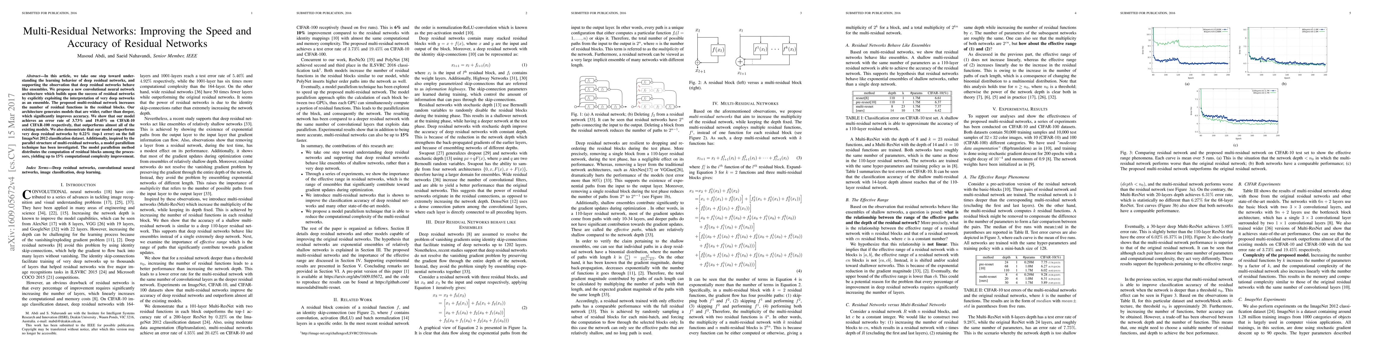 In this article, we take one step toward understanding the learning behavior of deep residual networks, and supporting the observation that deep residual networks behave like ensembles. We propose a new convolutional neural network architecture which builds upon the success of residual networks by explicitly exploiting the interpretation of very deep networks as an ensemble. The proposed multi-residual network increases the number of residual functions in the residual blocks. Our architecture generates models that are wider, rather than deeper, which significantly improves accuracy. We show that our model achieves an error rate of 3.73% and 19.45% on CIFAR-10 and CIFAR-100 respectively, that outperforms almost all of the existing models. We also demonstrate that our model outperforms very deep residual networks by 0.22% (top-1 error) on the full ImageNet 2012 classification dataset. Additionally, inspired by the parallel structure of multi-residual networks, a model parallelism technique has been investigated. The model parallelism method distributes the computation of residual blocks among the processors, yielding up to 15% computational complexity improvement.