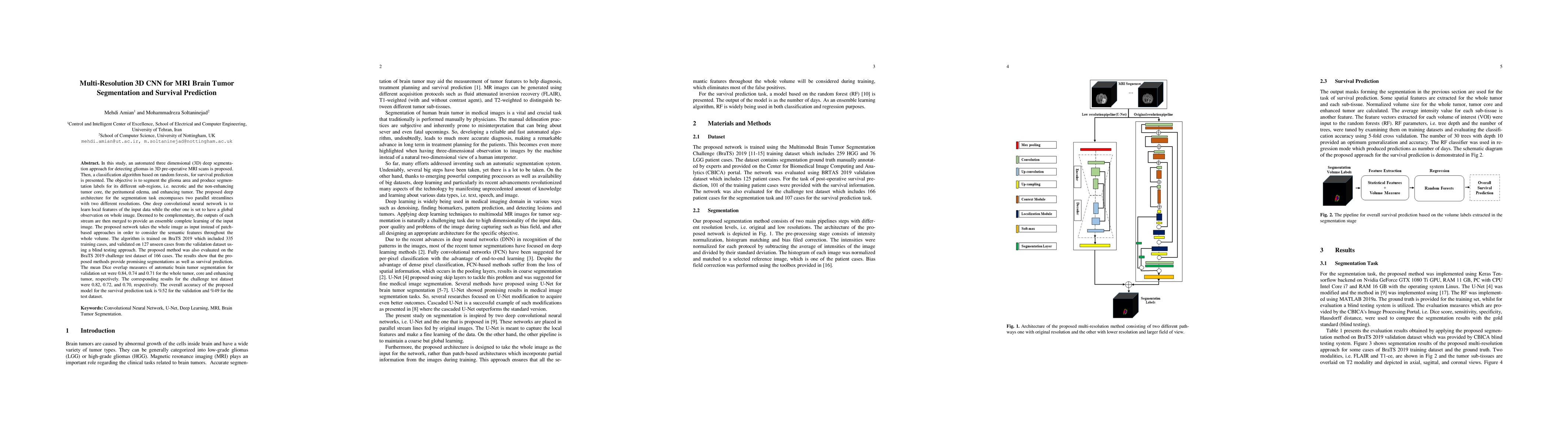 In this study, an automated three dimensional (3D) deep segmentation approach for detecting gliomas in 3D pre-operative MRI scans is proposed. Then, a classi-fication algorithm based on random forests, for survival prediction is presented. The objective is to segment the glioma area and produce segmentation labels for its different sub-regions, i.e. necrotic and the non-enhancing tumor core, the peri-tumoral edema, and enhancing tumor. The proposed deep architecture for the segmentation task encompasses two parallel streamlines with two different reso-lutions. One deep convolutional neural network is to learn local features of the input data while the other one is set to have a global observation on whole image. Deemed to be complementary, the outputs of each stream are then merged to pro-vide an ensemble complete learning of the input image. The proposed network takes the whole image as input instead of patch-based approaches in order to con-sider the semantic features throughout the whole volume. The algorithm is trained on BraTS 2019 which included 335 training cases, and validated on 127 unseen cases from the validation dataset using a blind testing approach. The proposed method was also evaluated on the BraTS 2019 challenge test dataset of 166 cases. The results show that the proposed methods provide promising segmentations as well as survival prediction. The mean Dice overlap measures of automatic brain tumor segmentation for validation set were 0.84, 0.74 and 0.71 for the whole tu-mor, core and enhancing tumor, respectively. The corresponding results for the challenge test dataset were 0.82, 0.72, and 0.70, respectively. The overall accura-cy of the proposed model for the survival prediction task is %52 for the valida-tion and %49 for the test dataset.