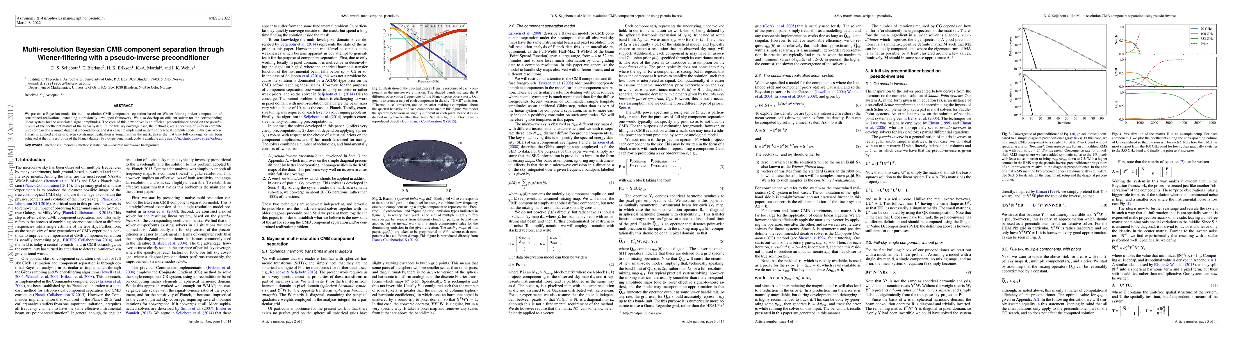 This paper introduces a Bayesian model for multi-resolution separation of Cosmic Microwave Background (CMB) components using Wiener filtering and a pseudo-inverse preconditioner. The new solver significantly speeds up computation by 2-3x compared to traditional methods and achieves full convergence in masked regions.