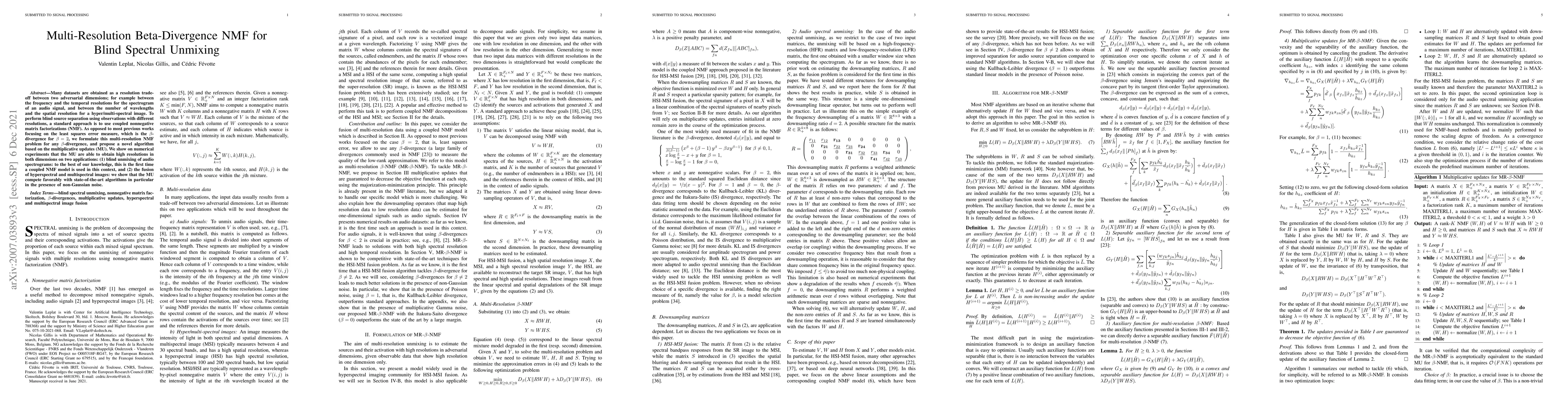 This paper proposes a multi-resolution nonnegative matrix factorization (NMF) approach using beta-divergence for blind spectral unmixing, employing multiplicative updates. It demonstrates the effectiveness of the method in audio spectrogram unmixing and the fusion of hyperspectral and multispectral images, outperforming state-of-the-art algorithms in noisy conditions.