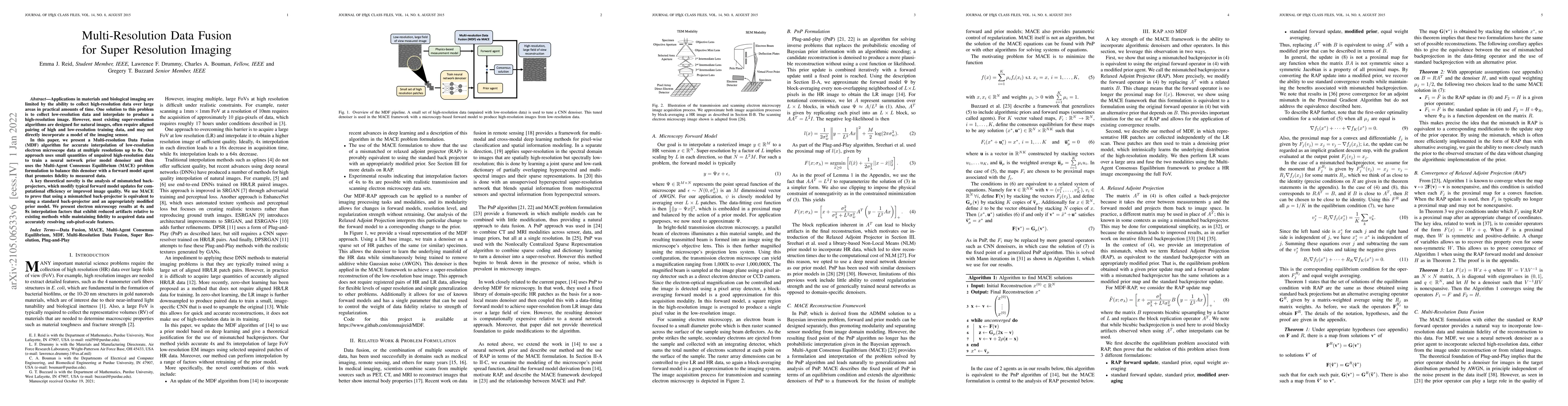 This paper introduces a Multi-resolution Data Fusion (MDF) algorithm for super-resolution imaging, utilizing unpaired high-resolution data to train a neural network denoiser and employing the Multi-Agent Consensus Equilibrium (MACE) to balance fidelity to measured data. The method shows reduced artifacts and improved resolution in electron microscopy images compared to existing techniques.