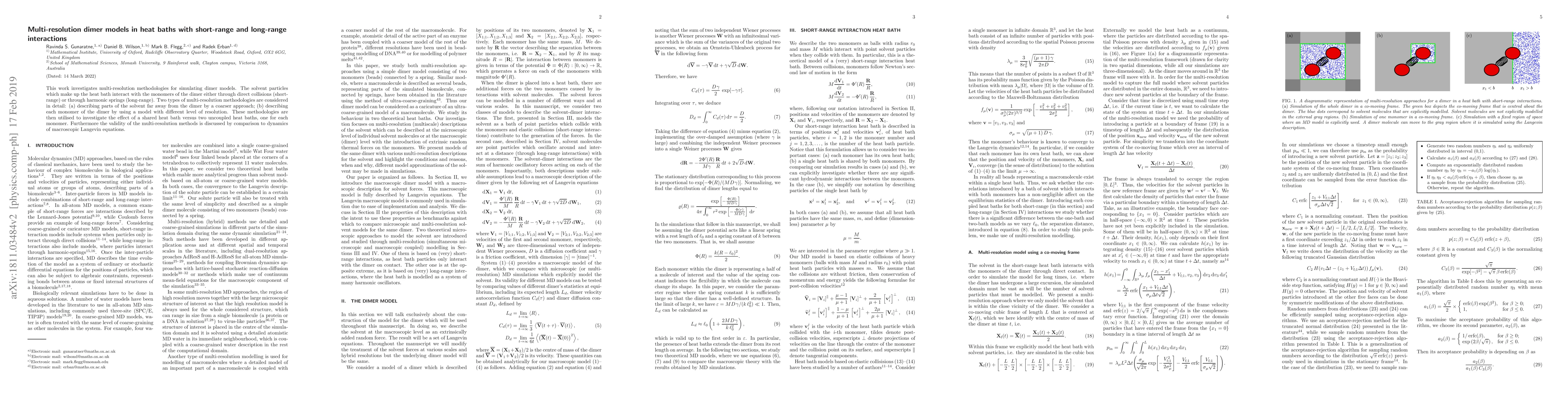 This work investigates multi-resolution methodologies for simulating dimer models. The solvent particles which make up the heat bath interact with the monomers of the dimer either through direct collisions (short-range) or through harmonic springs (long-range). Two types of multi-resolution methodologies are considered in detail: (a) describing parts of the solvent far away from the dimer by a coarser approach; (b) describing each monomer of the dimer by using a model with different level of resolution. These methodologies are then utilised to investigate the effect of a shared heat bath versus two uncoupled heat baths, one for each monomer. Furthermore the validity of the multi-resolution methods is discussed by comparison to dynamics of macroscopic Langevin equations.
