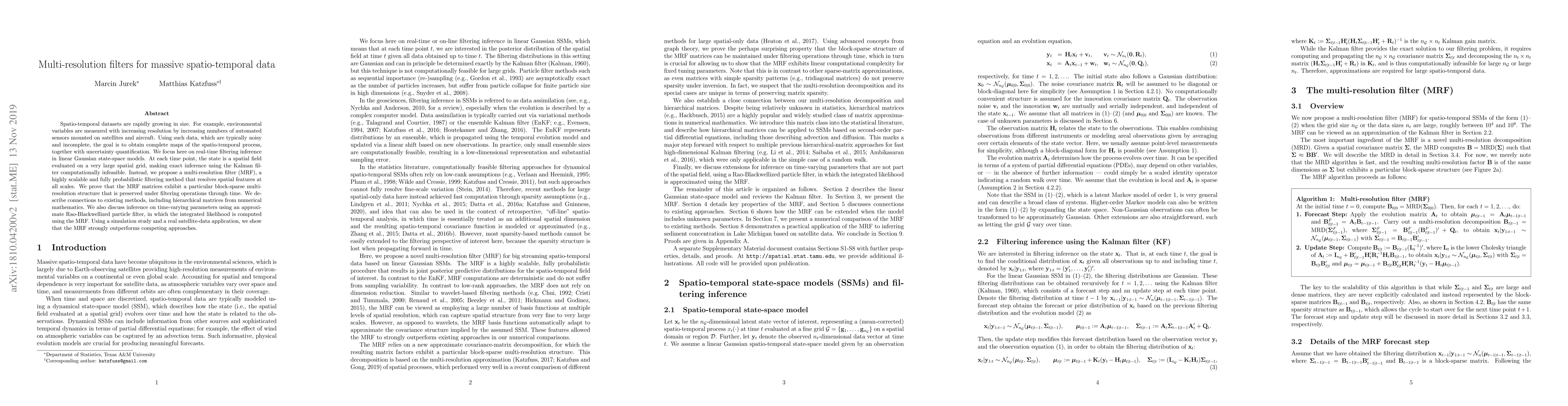 This paper proposes a multi-resolution filter (MRF) for real-time inference in large spatio-temporal data sets, addressing computational infeasibility of exact filtering methods. The MRF leverages a block-sparse structure to efficiently resolve spatial features at various scales, and is compared against existing methods using simulations and satellite data.