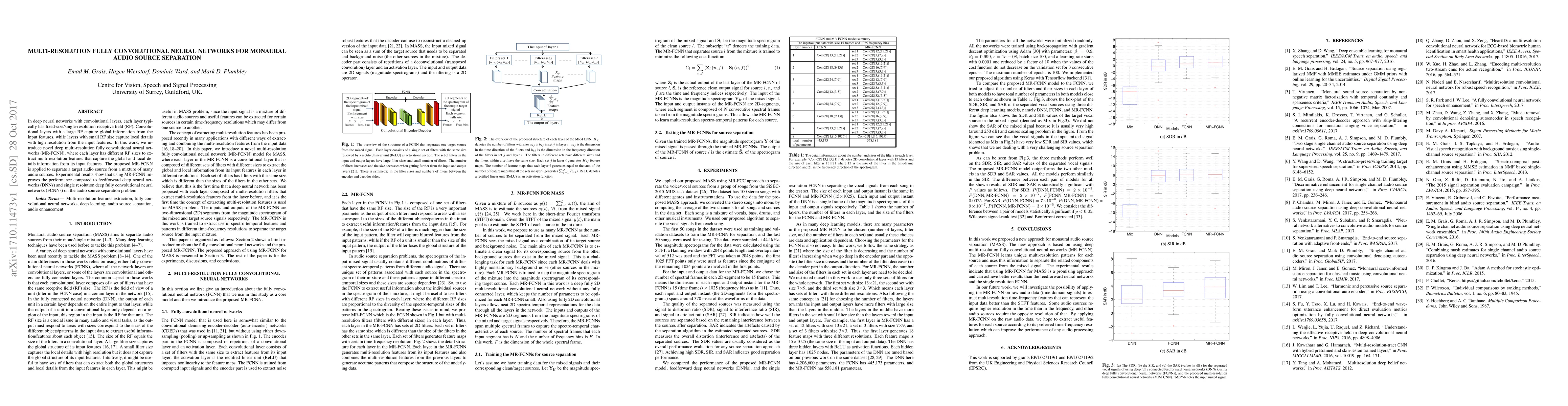 In deep neural networks with convolutional layers, each layer typically has fixed-size/single-resolution receptive field (RF). Convolutional layers with a large RF capture global information from the input features, while layers with small RF size capture local details with high resolution from the input features. In this work, we introduce novel deep multi-resolution fully convolutional neural networks (MR-FCNN), where each layer has different RF sizes to extract multi-resolution features that capture the global and local details information from its input features. The proposed MR-FCNN is applied to separate a target audio source from a mixture of many audio sources. Experimental results show that using MR-FCNN improves the performance compared to feedforward deep neural networks (DNNs) and single resolution deep fully convolutional neural networks (FCNNs) on the audio source separation problem.