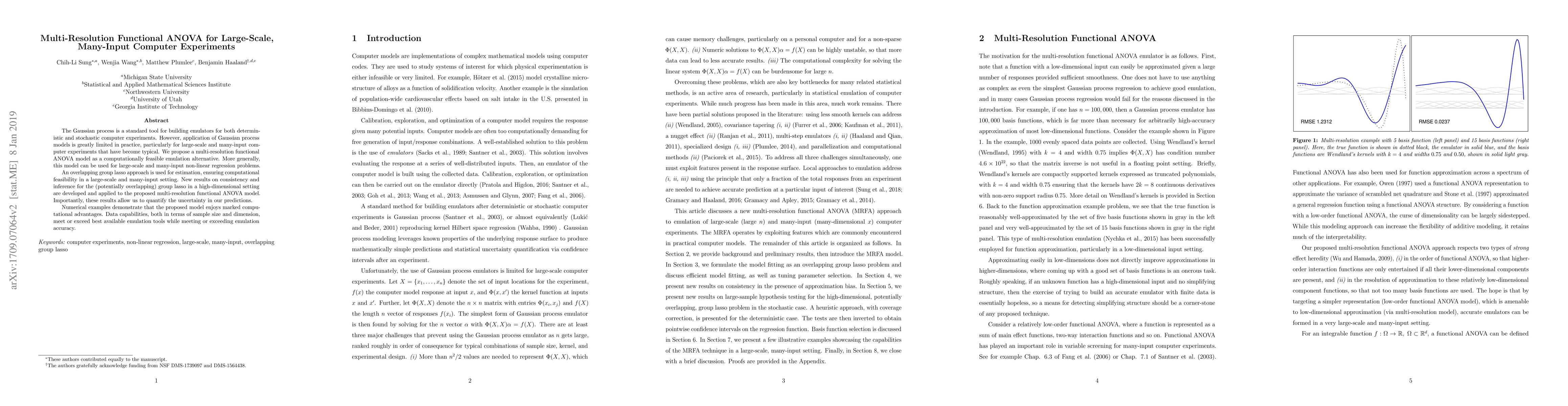 This paper proposes a multi-resolution functional ANOVA model for large-scale and many-input computer experiments, using an overlapping group lasso approach for estimation. It develops new consistency and inference results for high-dimensional group lasso, demonstrating computational advantages and competitive accuracy compared to existing methods.