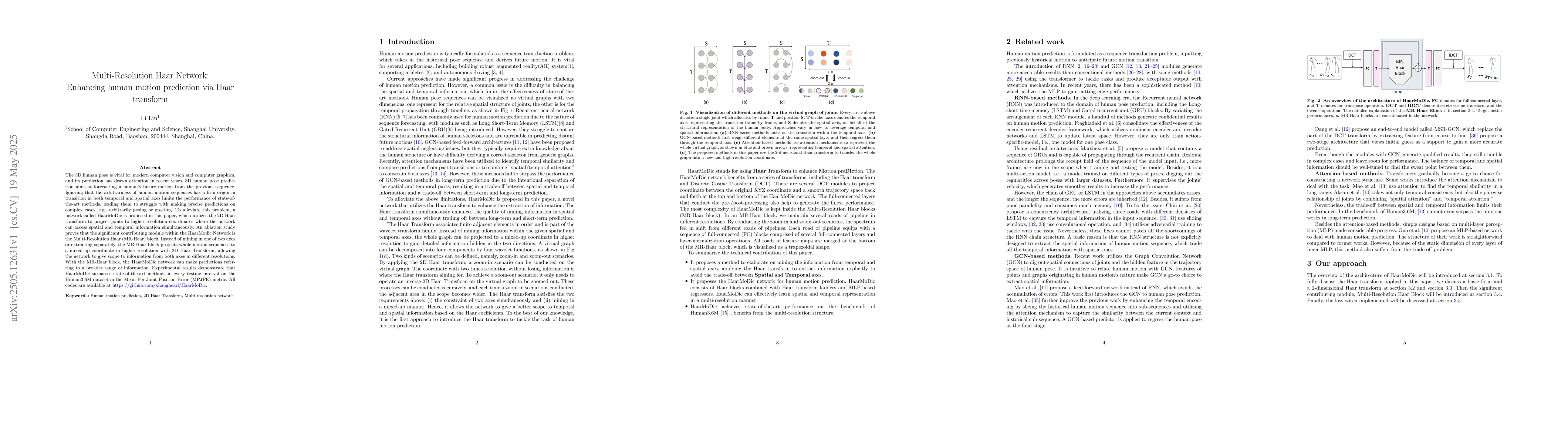 The 3D human pose is vital for modern computer vision and computer graphics, and its prediction has drawn attention in recent years. 3D human pose prediction aims at forecasting a human's future motion from the previous sequence. Ignoring that the arbitrariness of human motion sequences has a firm origin in transition in both temporal and spatial axes limits the performance of state-of-the-art methods, leading them to struggle with making precise predictions on complex cases, e.g., arbitrarily posing or greeting. To alleviate this problem, a network called HaarMoDic is proposed in this paper, which utilizes the 2D Haar transform to project joints to higher resolution coordinates where the network can access spatial and temporal information simultaneously. An ablation study proves that the significant contributing module within the HaarModic Network is the Multi-Resolution Haar (MR-Haar) block. Instead of mining in one of two axes or extracting separately, the MR-Haar block projects whole motion sequences to a mixed-up coordinate in higher resolution with 2D Haar Transform, allowing the network to give scope to information from both axes in different resolutions. With the MR-Haar block, the HaarMoDic network can make predictions referring to a broader range of information. Experimental results demonstrate that HaarMoDic surpasses state-of-the-art methods in every testing interval on the Human3.6M dataset in the Mean Per Joint Position Error (MPJPE) metric.