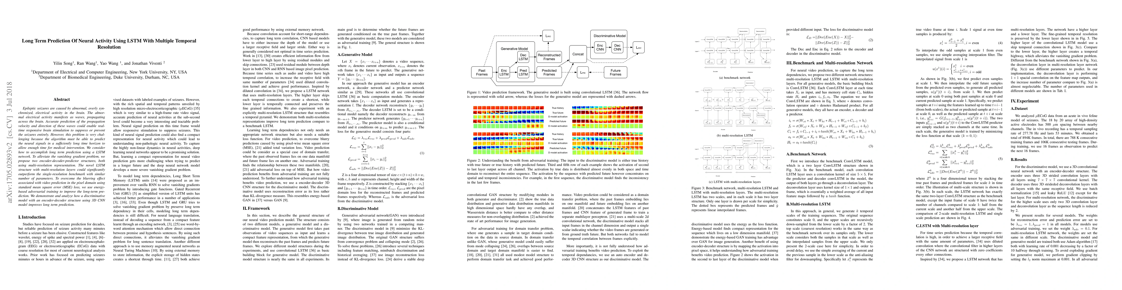 Epileptic seizures are caused by abnormal, overly syn- chronized, electrical activity in the brain. The abnor- mal electrical activity manifests as waves, propagating across the brain. Accurate prediction of the propagation velocity and direction of these waves could enable real- time responsive brain stimulation to suppress or prevent the seizures entirely. However, this problem is very chal- lenging because the algorithm must be able to predict the neural signals in a sufficiently long time horizon to allow enough time for medical intervention. We consider how to accomplish long term prediction using a LSTM network. To alleviate the vanishing gradient problem, we propose two encoder-decoder-predictor structures, both using multi-resolution representation. The novel LSTM structure with multi-resolution layers could significantly outperform the single-resolution benchmark with similar number of parameters. To overcome the blurring effect associated with video prediction in the pixel domain using standard mean square error (MSE) loss, we use energy- based adversarial training to improve the long-term pre- diction. We demonstrate and analyze how a discriminative model with an encoder-decoder structure using 3D CNN model improves long term prediction.