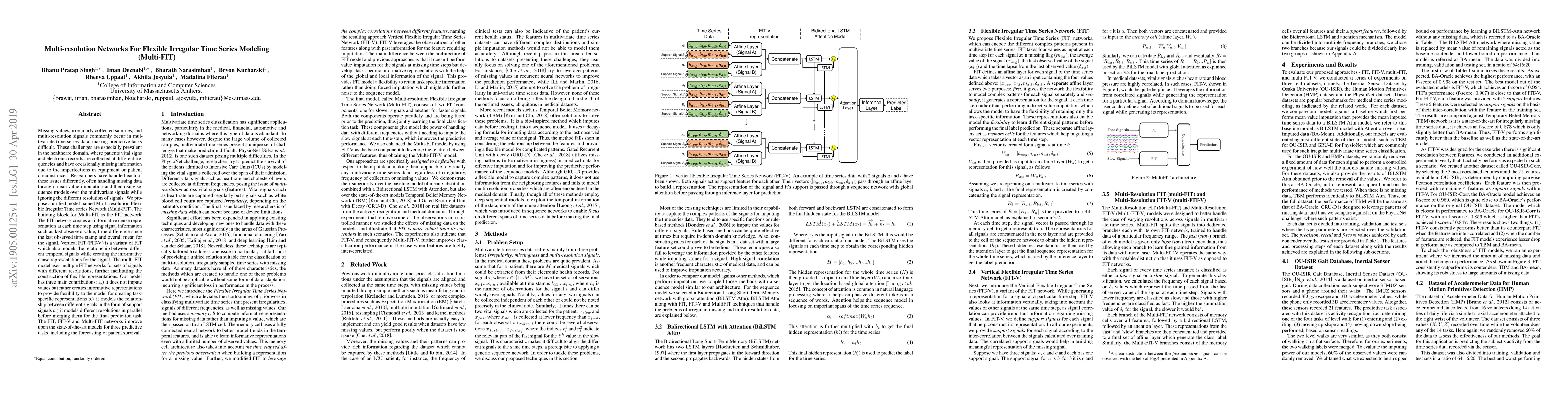 A new model called Multi-FIT is proposed to handle irregular time series data with missing values and different signal resolutions in healthcare applications. It creates informative dense representations without imputing values and models relationships between signals and different resolutions in parallel.