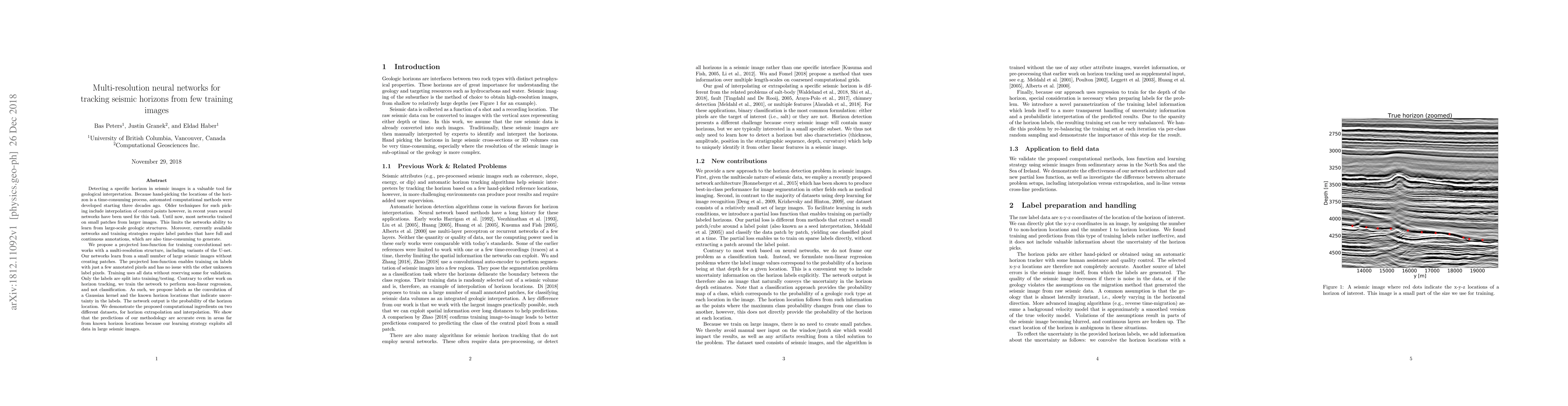 Detecting a specific horizon in seismic images is a valuable tool for geological interpretation. Because hand-picking the locations of the horizon is a time-consuming process, automated computational methods were developed starting three decades ago. Older techniques for such picking include interpolation of control points however, in recent years neural networks have been used for this task. Until now, most networks trained on small patches from larger images. This limits the networks ability to learn from large-scale geologic structures. Moreover, currently available networks and training strategies require label patches that have full and continuous annotations, which are also time-consuming to generate. We propose a projected loss-function for training convolutional networks with a multi-resolution structure, including variants of the U-net. Our networks learn from a small number of large seismic images without creating patches. The projected loss-function enables training on labels with just a few annotated pixels and has no issue with the other unknown label pixels. Training uses all data without reserving some for validation. Only the labels are split into training/testing. Contrary to other work on horizon tracking, we train the network to perform non-linear regression, and not classification. As such, we propose labels as the convolution of a Gaussian kernel and the known horizon locations that indicate uncertainty in the labels. The network output is the probability of the horizon location. We demonstrate the proposed computational ingredients on two different datasets, for horizon extrapolation and interpolation. We show that the predictions of our methodology are accurate even in areas far from known horizon locations because our learning strategy exploits all data in large seismic images.