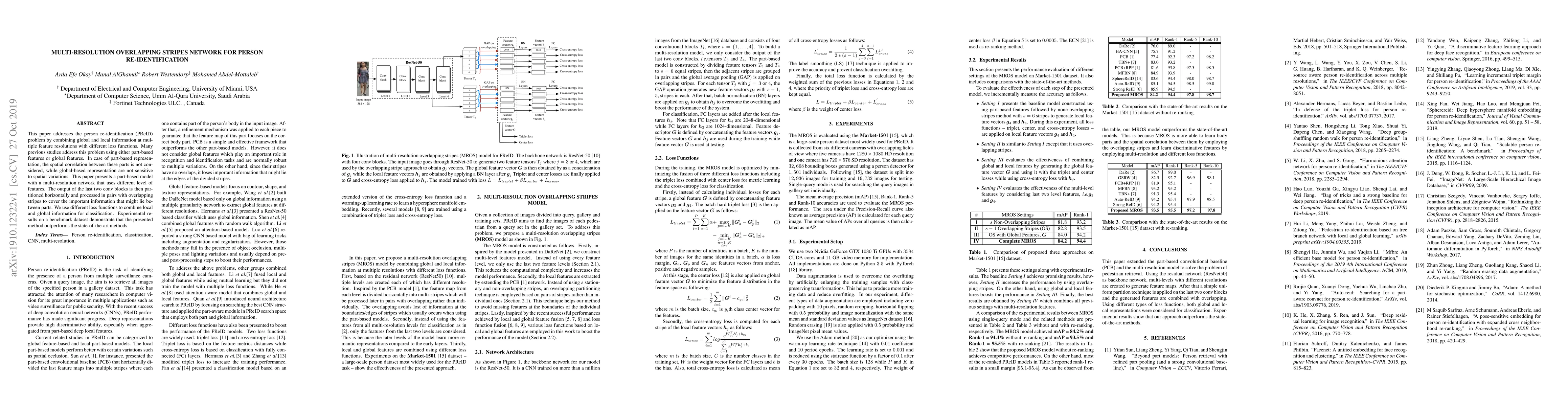 This paper addresses the person re-identification (PReID) problem by combining global and local information at multiple feature resolutions with different loss functions. Many previous studies address this problem using either part-based features or global features. In case of part-based representation, the spatial correlation between these parts is not considered, while global-based representation are not sensitive to spatial variations. This paper presents a part-based model with a multi-resolution network that uses different level of features. The output of the last two conv blocks is then partitioned horizontally and processed in pairs with overlapping stripes to cover the important information that might lie between parts. We use different loss functions to combine local and global information for classification. Experimental results on a benchmark dataset demonstrate that the presented method outperforms the state-of-the-art methods.