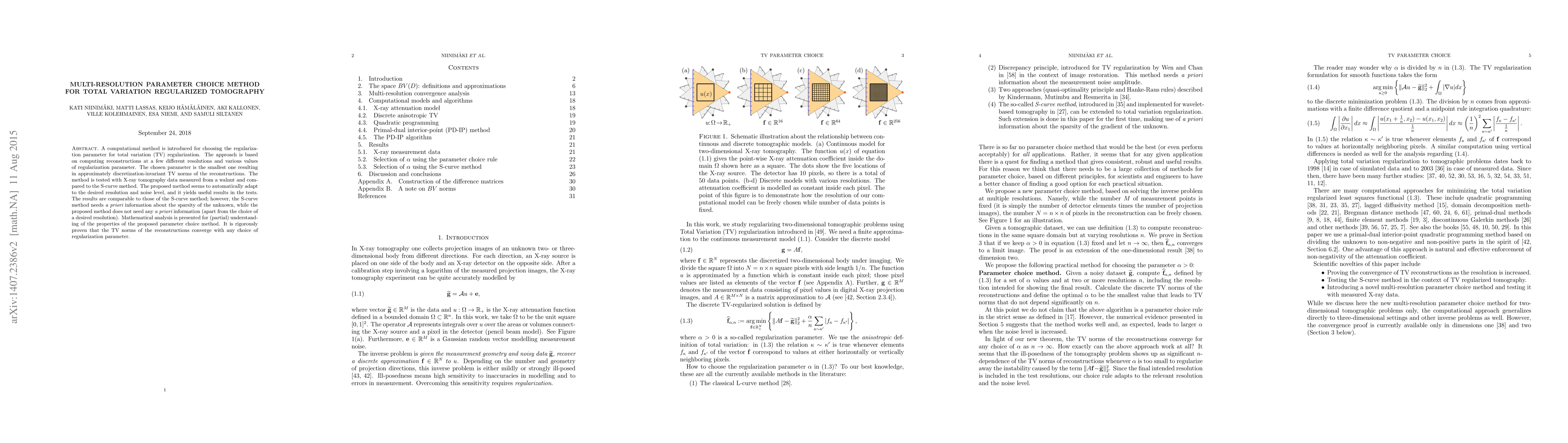 A computational method is introduced for choosing the regularization parameter for total variation (TV) regularization. The approach is based on computing reconstructions at a few different resolutions and various values of regularization parameter. The chosen parameter is the smallest one resulting in approximately discretization-invariant TV norms of the reconstructions. The method is tested with X-ray tomography data measured from a walnut and compared to the S-curve method. The proposed method seems to automatically adapt to the desired resolution and noise level, and it yields useful results in the tests. The results are comparable to those of the S-curve method; however, the S-curve method needs a priori information about the sparsity of the unknown, while the proposed method does not need any a priori information (apart from the choice of a desired resolution). Mathematical analysis is presented for (partial) understanding of the properties of the proposed parameter choice method. It is rigorously proven that the TV norms of the reconstructions converge with any choice of regularization parameter.