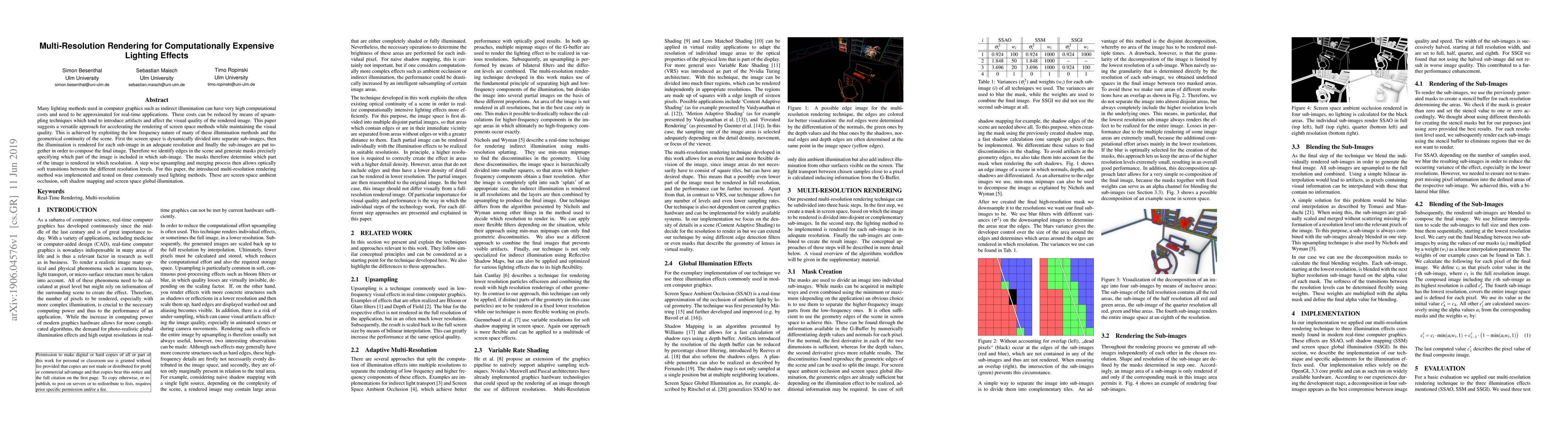 Many lighting methods used in computer graphics such as indirect illumination can have very high computational costs and need to be approximated for real-time applications. These costs can be reduced by means of upsampling techniques which tend to introduce artifacts and affect the visual quality of the rendered image. This paper suggests a versatile approach for accelerating the rendering of screen space methods while maintaining the visual quality. This is achieved by exploiting the low frequency nature of many of these illumination methods and the geometrical continuity of the scene. First the screen space is dynamically divided into separate sub-images, then the illumination is rendered for each sub-image in an adequate resolution and finally the sub-images are put together in order to compose the final image. Therefore we identify edges in the scene and generate masks precisely specifying which part of the image is included in which sub-image. The masks therefore determine which part of the image is rendered in which resolution. A step wise upsampling and merging process then allows optically soft transitions between the different resolution levels. For this paper, the introduced multi-resolution rendering method was implemented and tested on three commonly used lighting methods. These are screen space ambient occlusion, soft shadow mapping and screen space global illumination.