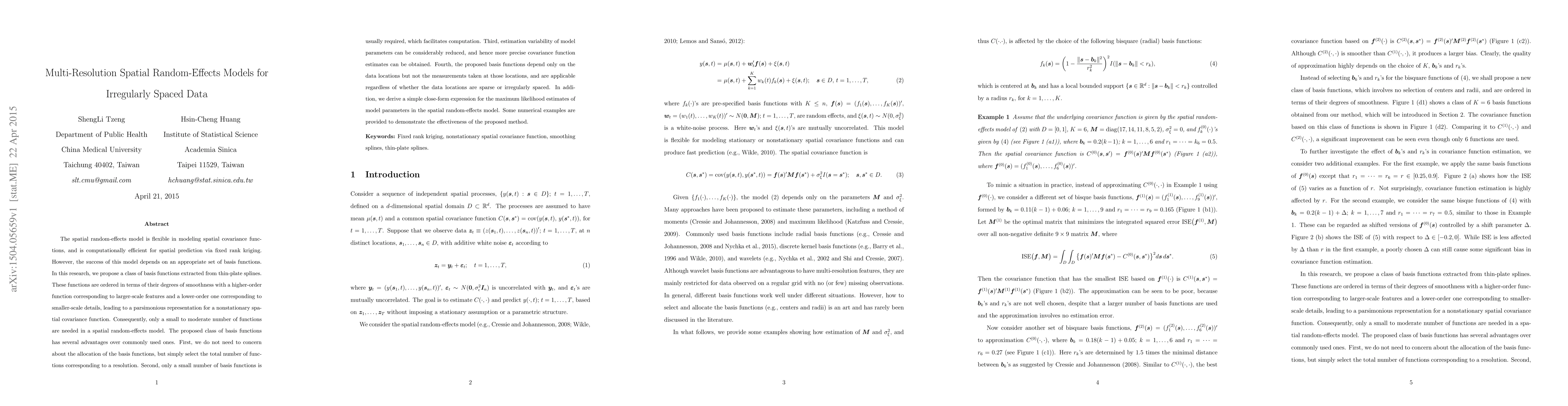 This paper proposes a new class of basis functions derived from thin-plate splines for spatial random-effects models, which are organized by smoothness to efficiently model nonstationary spatial covariance functions. The method reduces computational burden and improves parameter estimation precision, applicable to irregularly spaced data.