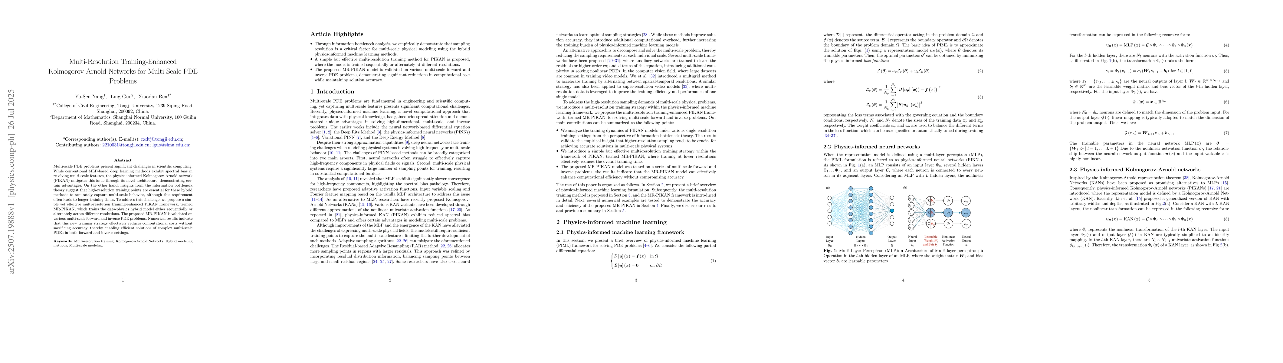 Multi-scale PDE problems present significant challenges in scientific computing. While conventional MLP-based deep learning methods exhibit spectral bias in resolving multi-scale features, the physics-informed Kolmogorov-Arnold network (PIKAN) mitigates this issue through its novel architecture, demonstrating certain advantages. On the other hand, insights from the information bottleneck theory suggest that high-resolution training points are essential for these hybrid methods to accurately capture multi-scale behavior, although this requirement often leads to longer training times. To address this challenge, we propose a simple yet effective multi-resolution training-enhanced PIKAN framework, termed MR-PIKAN, which trains the data-physics hybrid model either sequentially or alternately across different resolutions. The proposed MR-PIKAN is validated on various multi-scale forward and inverse PDE problems. Numerical results indicate that this new training strategy effectively reduces computational costs without sacrificing accuracy, thereby enabling efficient solutions of complex multi-scale PDEs in both forward and inverse settings.